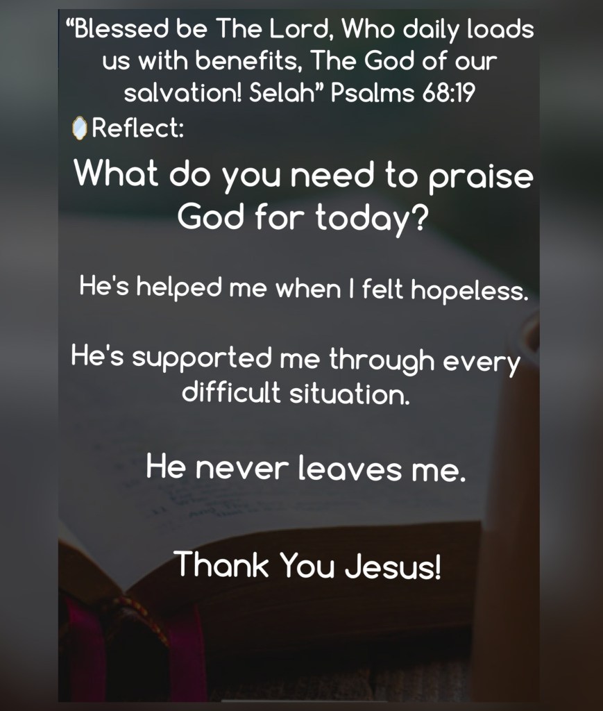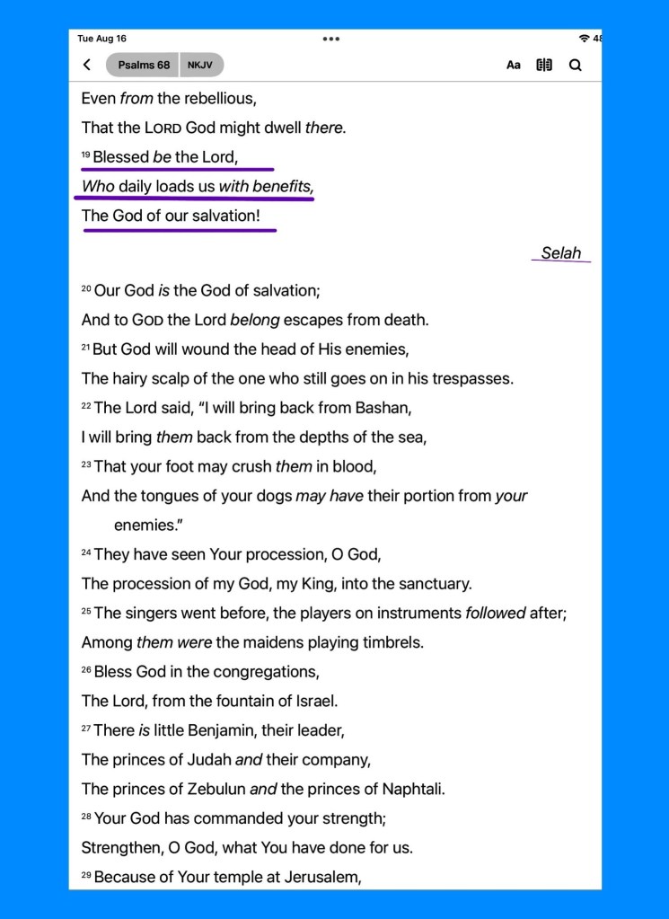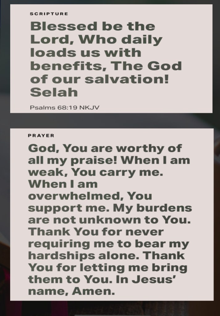 βBlessed be The Lord, who bears our burden day by day, The God who is our salvation! Selah.β Psalms 68:19 AMP