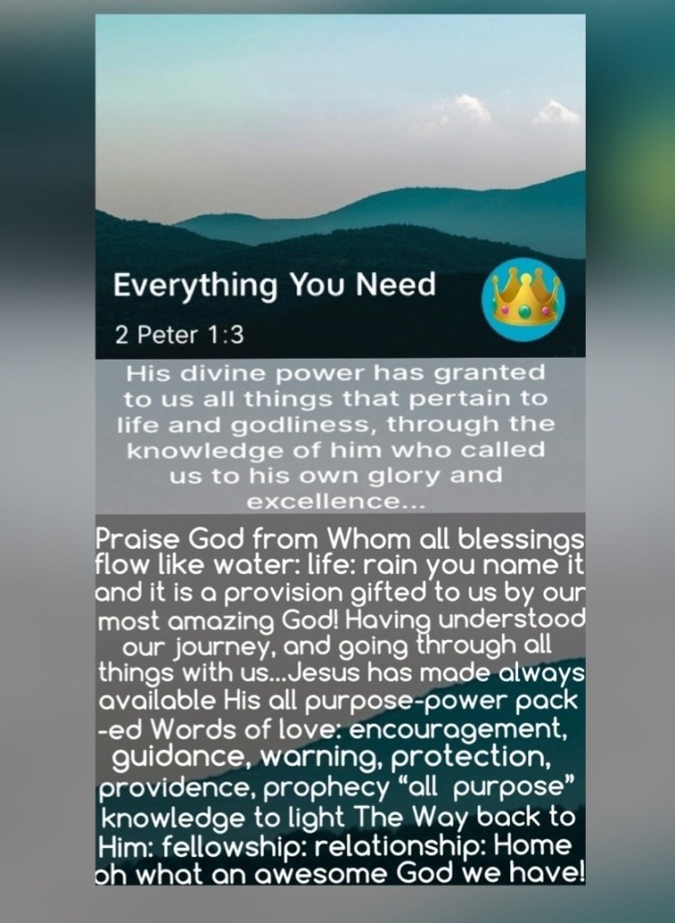 βFor His divine power has bestowed on us [absolutely] everything necessary for [a dynamic spiritual] life and godliness, through true and personal knowledge of Him who called us by His own glory and excellence.β 2 Peter 1:3 AMP