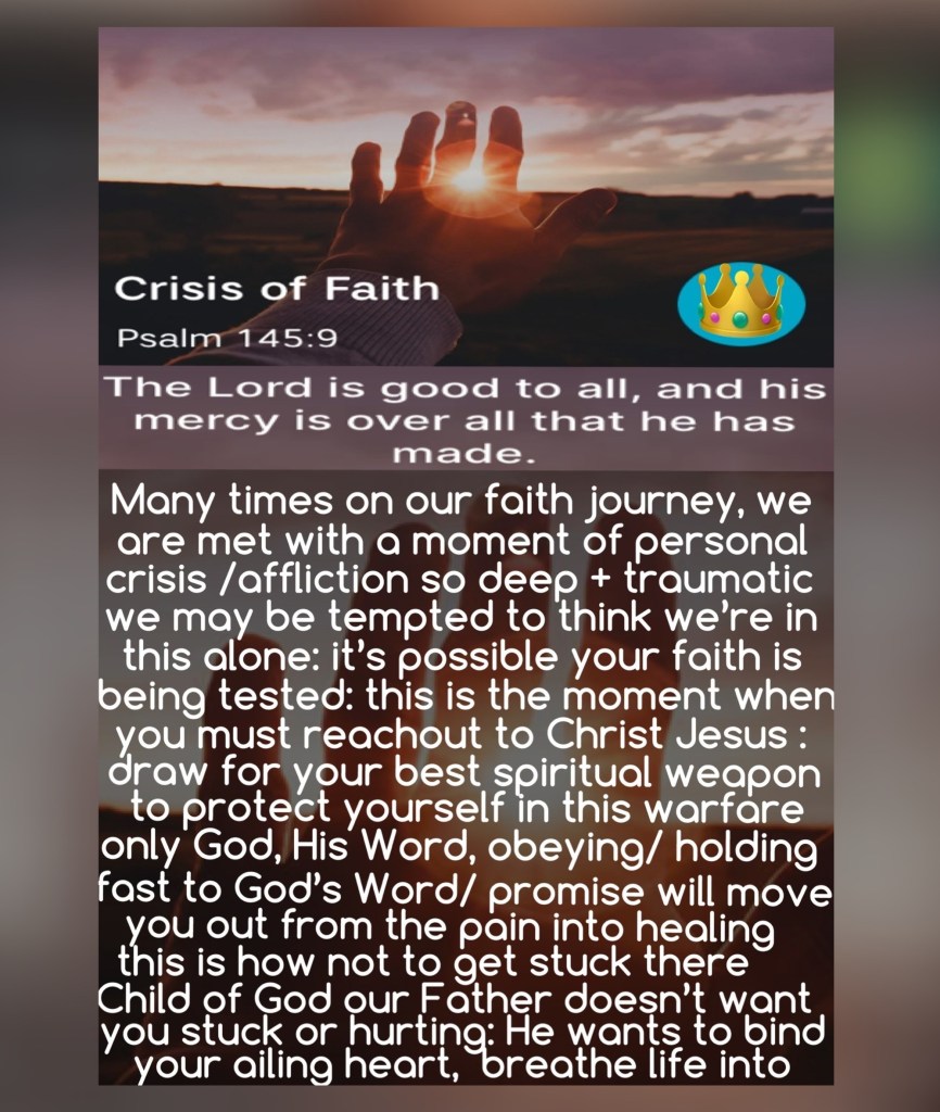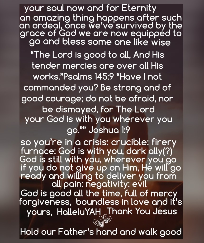 Just as we welcome a new week many are entering a new season in their lives; Praise God and move blessed in the assurance’s of God: “The Lord is good to all, And His tender mercies are over all His works.”Psalms 145:9 “Have I not commanded you? Be strong and of good courage; do not be afraid, nor be dismayed, for The Lord your God is with you wherever you go.”” Joshua 1:9 may this week bring comfort, peace, healing and a closer walk/ sense of the Presence of The Holy Spirit, this may be your crucible hour of crisis, cry out to Christ and know that He’s right there (even in the furnace) with you: covering you so you won’t be burned!