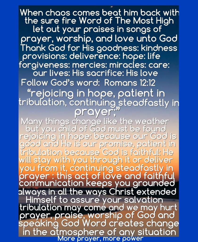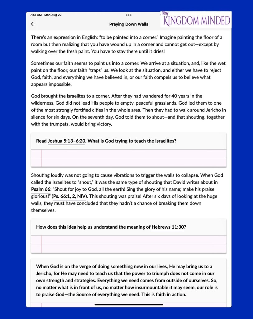 βconstantly rejoicing in hope [because of our confidence in Christ], steadfast and patient in distress, devoted to prayer [continually seeking wisdom, guidance, and strength],β Rom 12:12 AMP βAnd this I pray, that your love may abound more and more [displaying itself in greater depth] in real knowledge and in practical insight, so that you may learn to recognize and treasure what is excellent [identifying the best, and distinguishing moral differences], and that you may be pure and blameless until the day of Christ [actually living lives that lead others away from sin];β Phil 1:9-10 AMP π π Hebrews 11:30: By faith the walls of Jericho fell down after they were encircled for seven days. πΊ