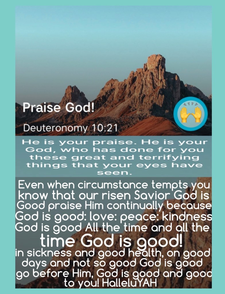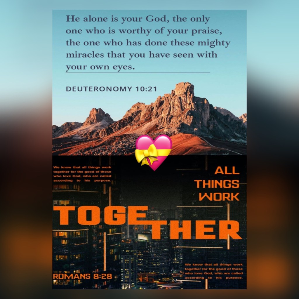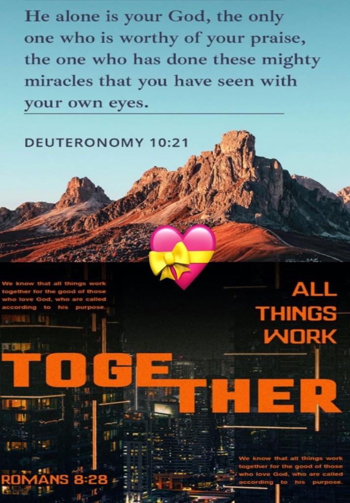 He is thy praise, and He is thy God, that hath done for thee these great and terrible things, which thine eyes have seen. Deuteronomy 10:21 KJV And we know that all things work together for good to them that love God, to them who are the called according to His purpose. Romans 8:28 KJV * “Bless The Lord, all His works, In all places of His dominion. Bless The Lord, O my soul!” Psalms 103:22 NKJV “Bless The Lord, O my soul; And all that is within me, bless His Holy Name!” Psalms 103:1 NKJV*