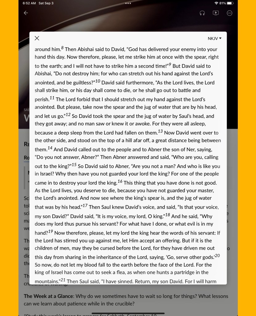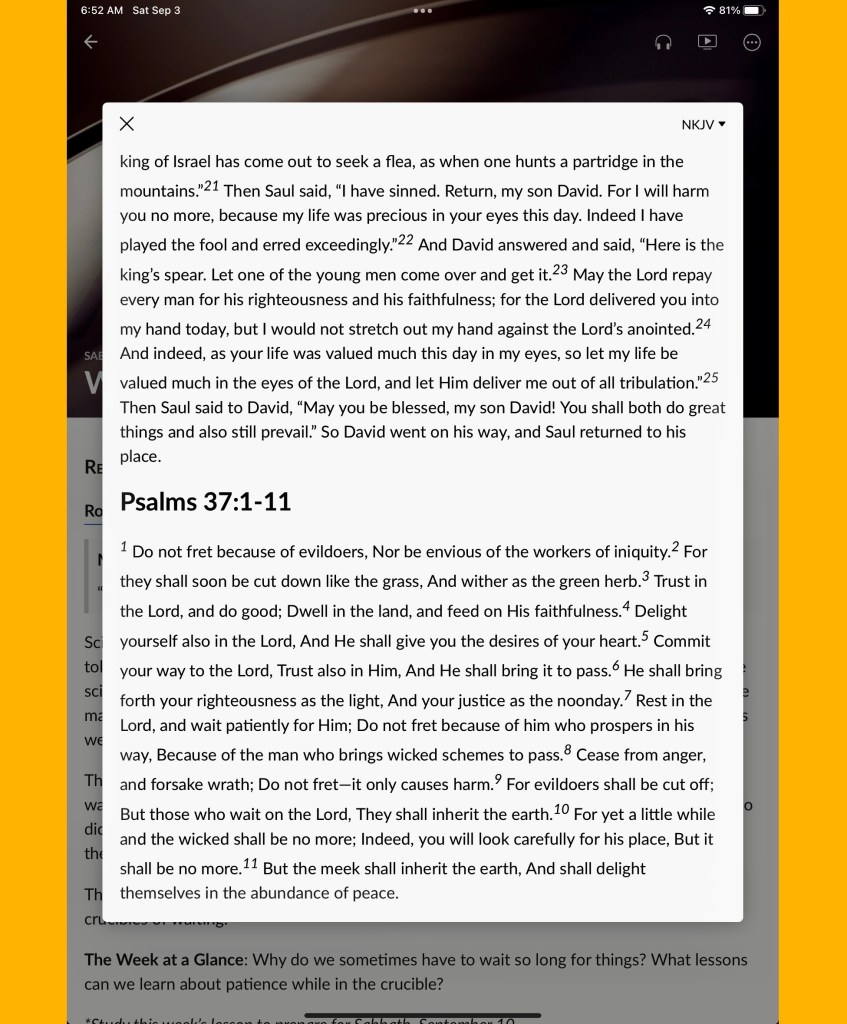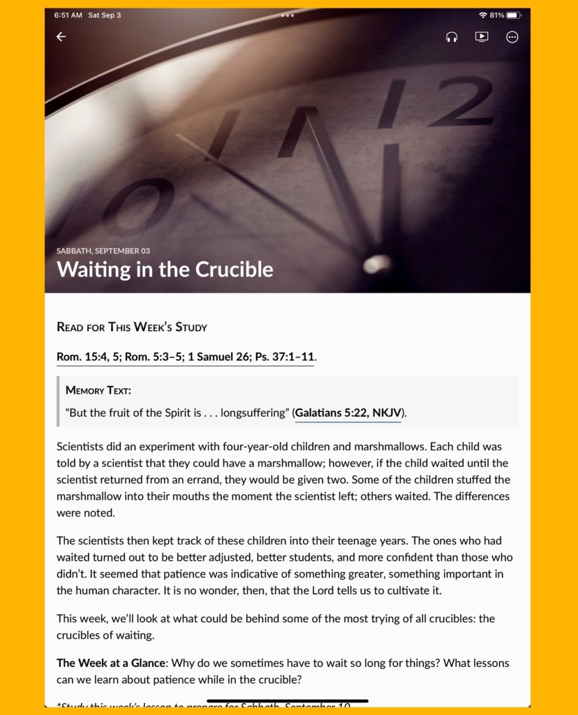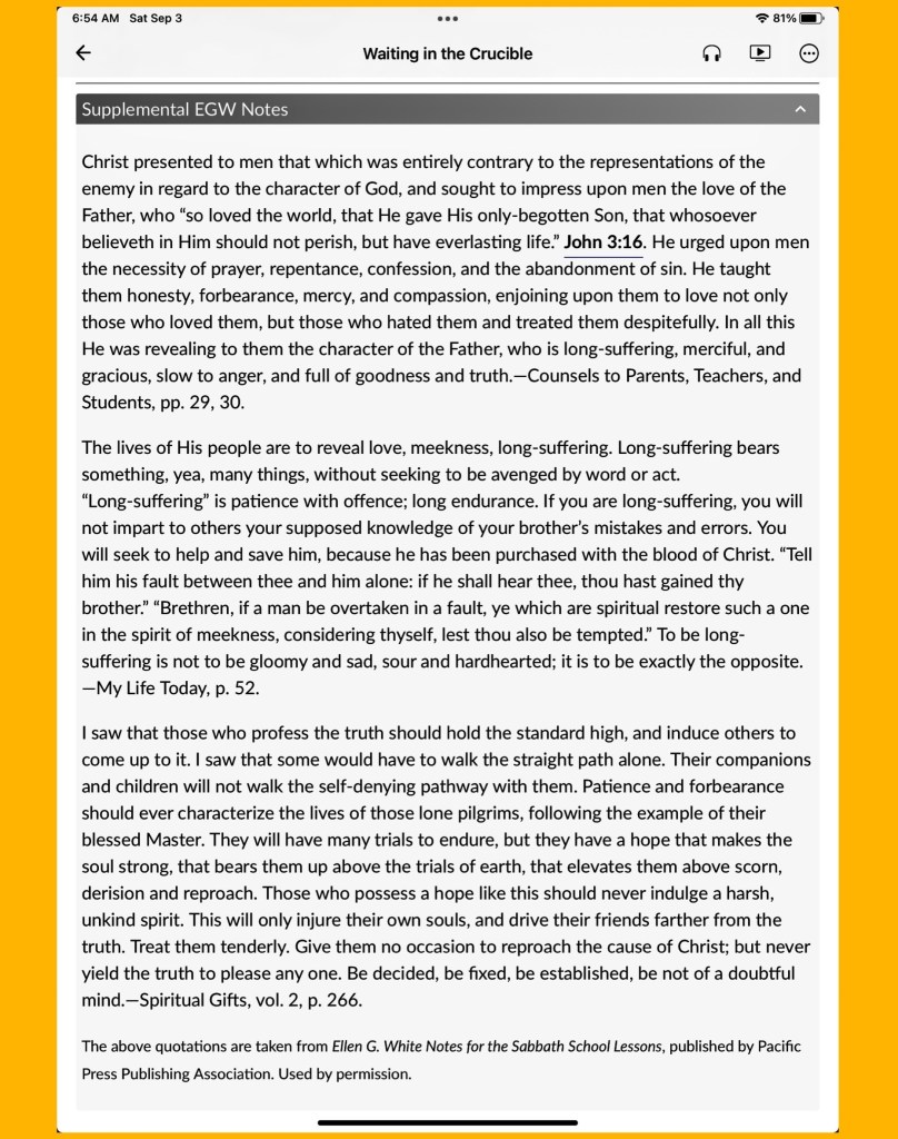 Relative insight: *Top stories : Listen to God’s Word: John 16:33, Evil costs, don’t get involved: 1 Thessalonians 5:15, You will sing: Revelation 15:3, Waiting in the crucible: Rom. 15:4, 5; Rom. 5:3–5; 1 Samuel 26; Ps. 37:1–11.