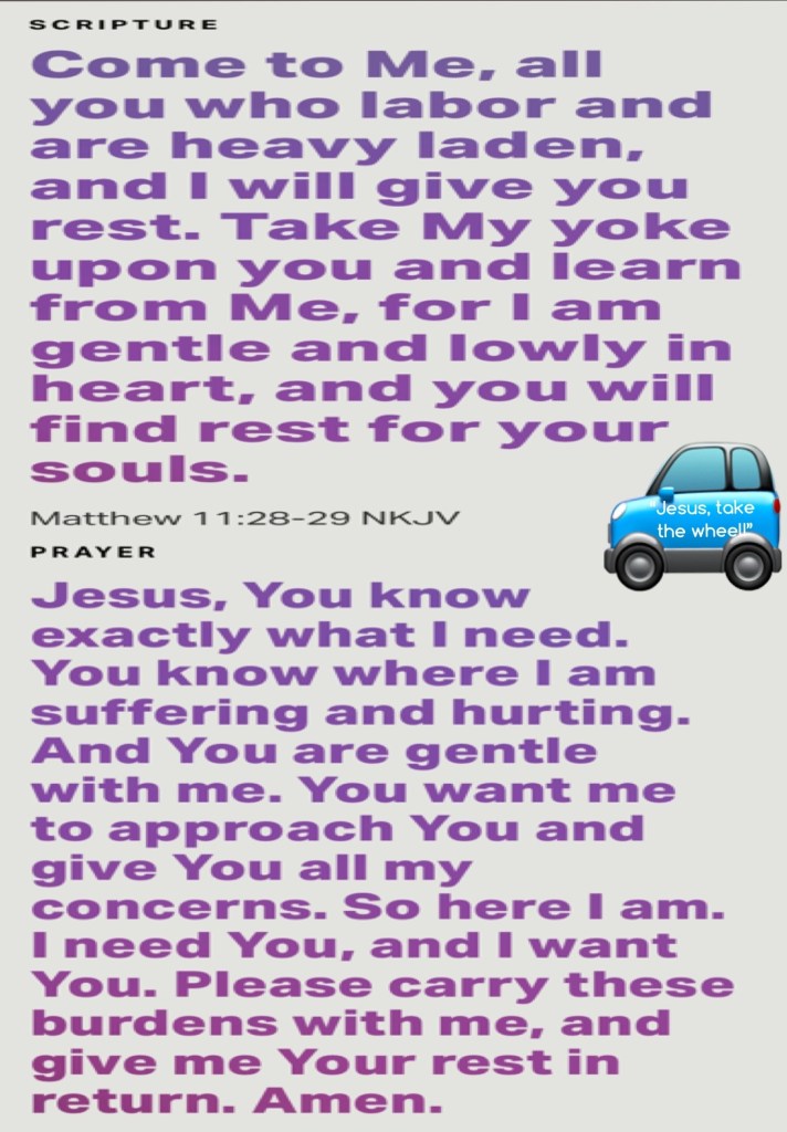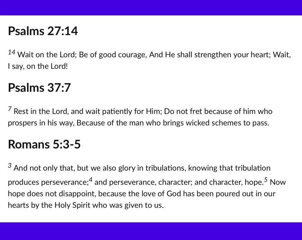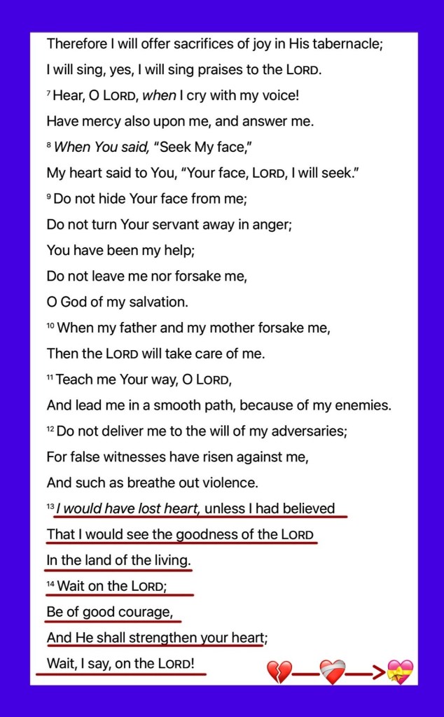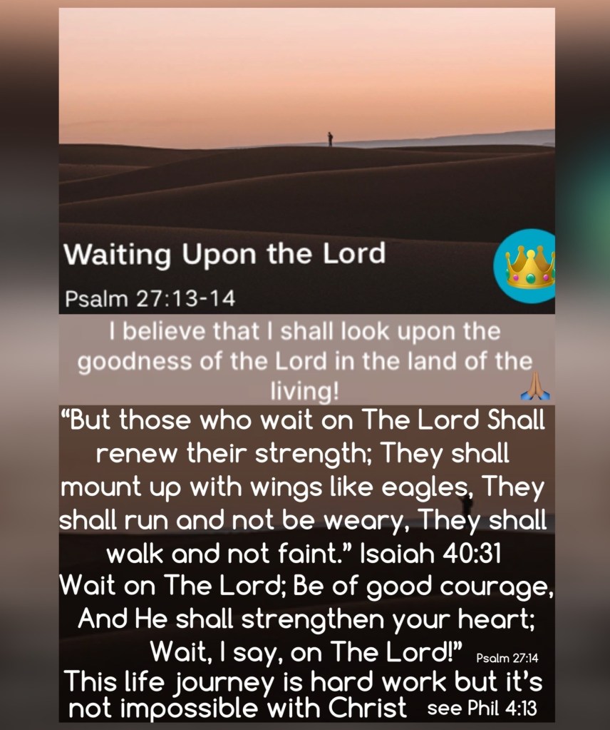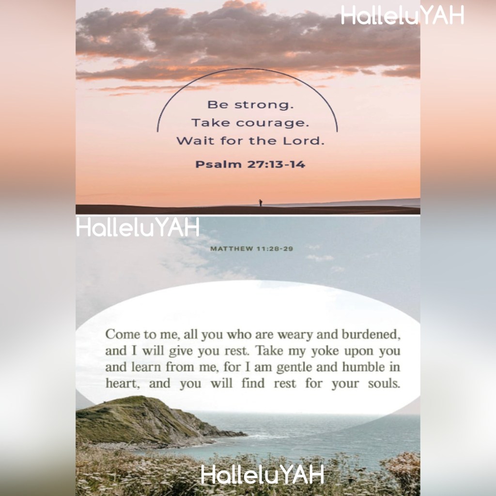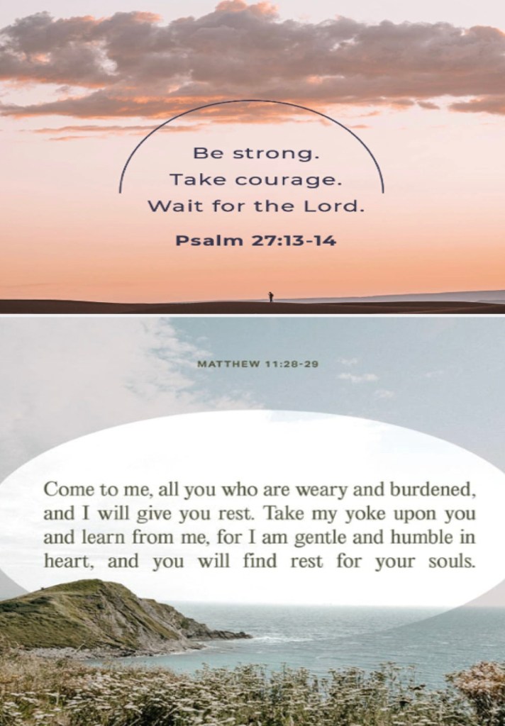 “I would have lost heart, unless I had believed That I would see the goodness of The Lord In the land of the living. Wait on The Lord; Be of good courage, And He shall strengthen your heart; Wait, I say, on The Lord!” Psalms 27:13-14 “Come to Me, all you who labor and are heavy laden, and I will give you rest. Take My yoke upon you and learn from Me, for I am gentle and lowly in heart, and you will find rest for your souls.” Matthew 11:28-29