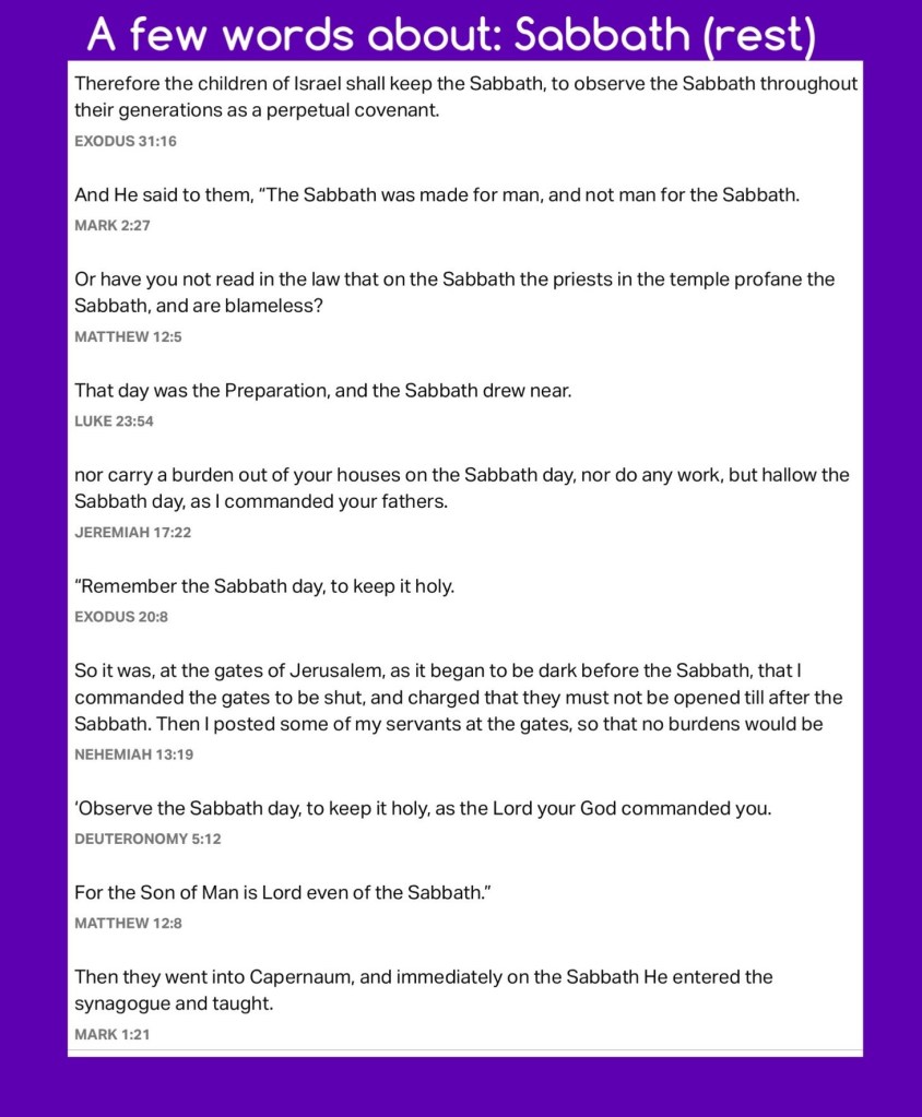 ““If you turn away your foot from the Sabbath, From doing your pleasure on My holy day, And call the Sabbath a delight, The holy day of The Lord honorable, And shall honor Him, not doing your own ways, Nor finding your own pleasure, Nor speaking your own words,” Isaiah 58:13 The Sabbath is meant to be a delight for all involved, especially when we follow the Word of God on the matter.