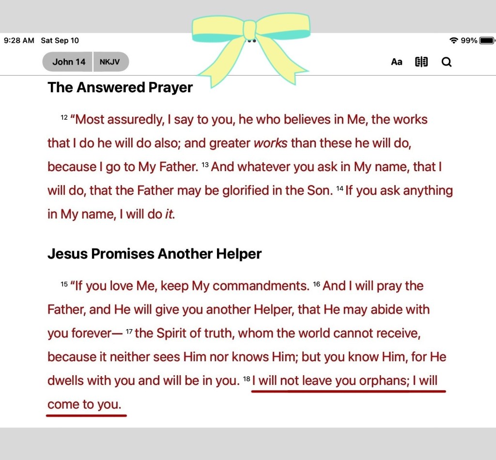 βI will not leave you orphans; I will come to you.β John 14:18 βAfter these things I looked, and behold, a great multitude which no one could number, of all nations, tribes, peoples, and tongues, standing before The Throne and before The Lamb, clothed with white robes, with palm branches in their hands, and crying out with a loud voice, saying, βSalvation belongs to our God who sits on The Throne, and to The Lamb!ββ Revelation 7:9-10