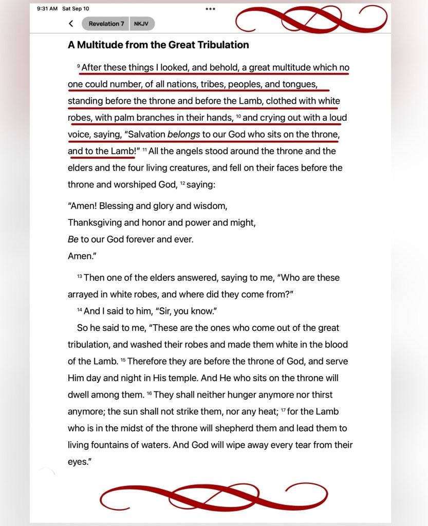 Rev 7:9 After this I beheld, and, lo, a great multitude, which no man could number, of all nations, and kindreds, and people, and tongues, stood before the throne, and before the Lamb, clothed with white robes, and palms in their hands;