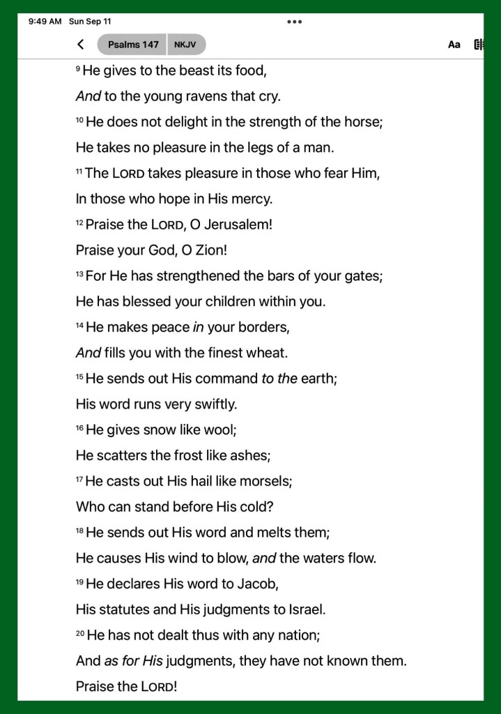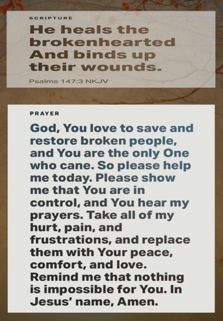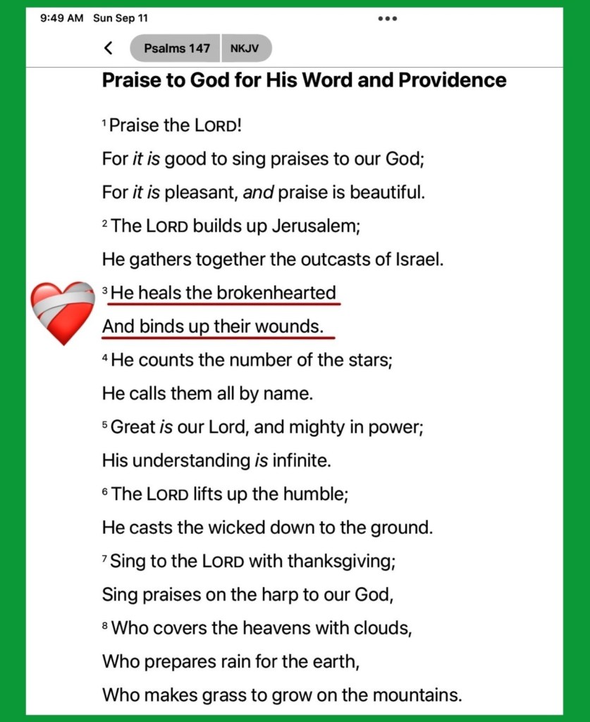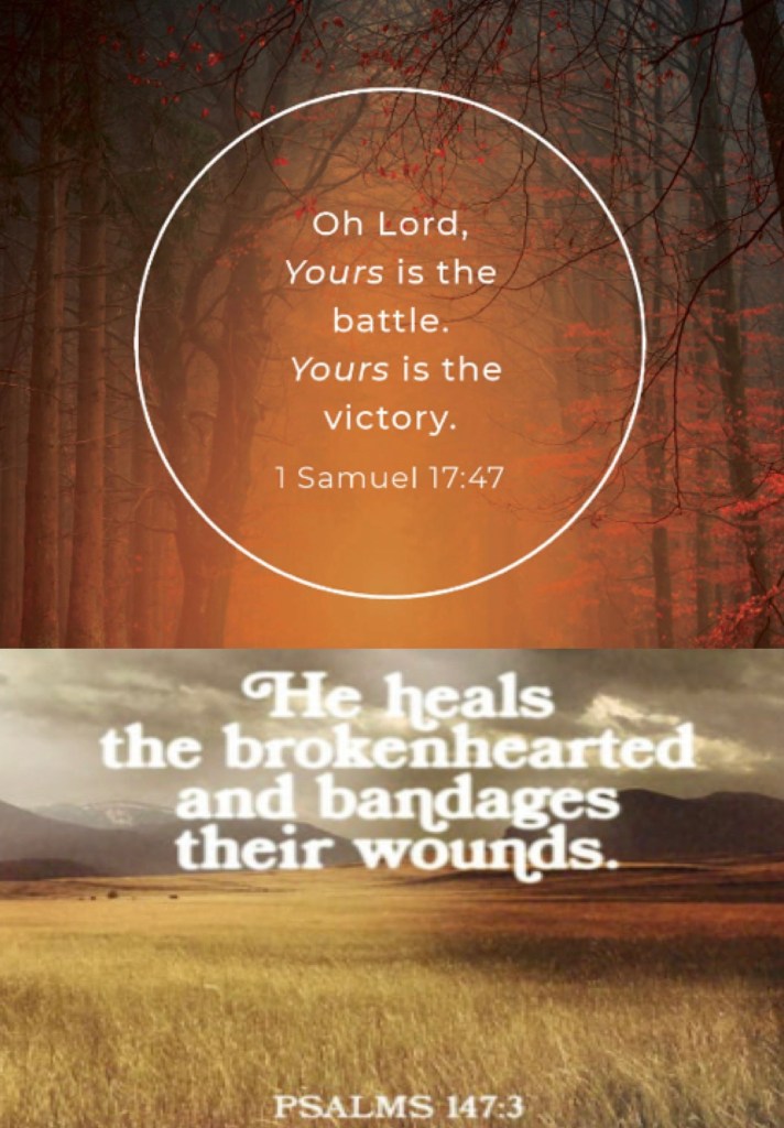 “Then all this assembly shall know that The Lord does not save with sword and spear; for the battle is The Lord’s, and He will give you into our hands.”” 1 Samuel 17:47. “He heals the brokenhearted And binds up their wounds.” Psalms 147:3