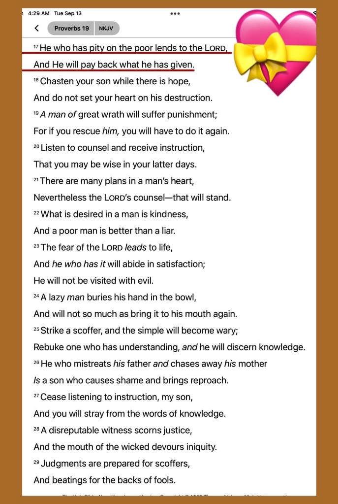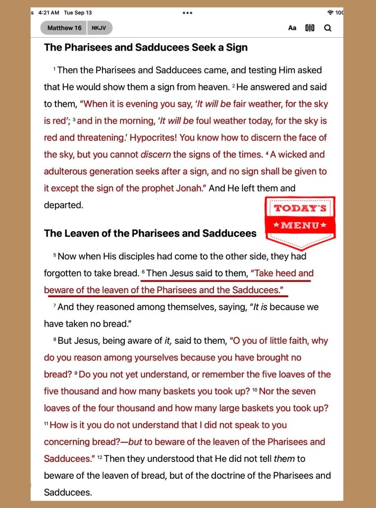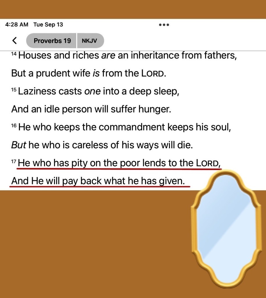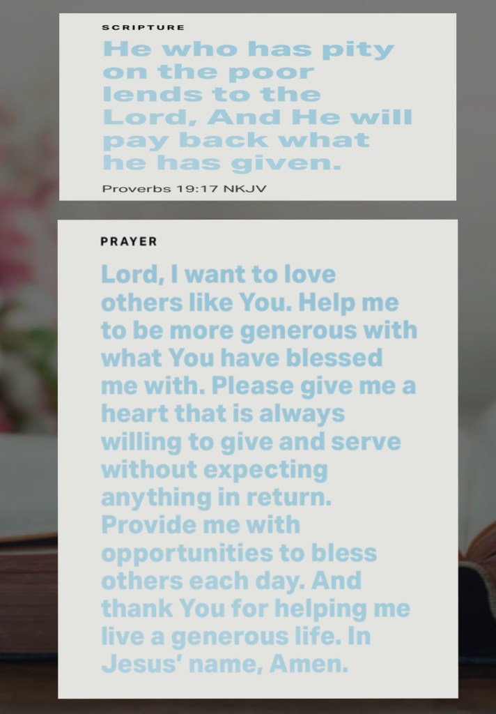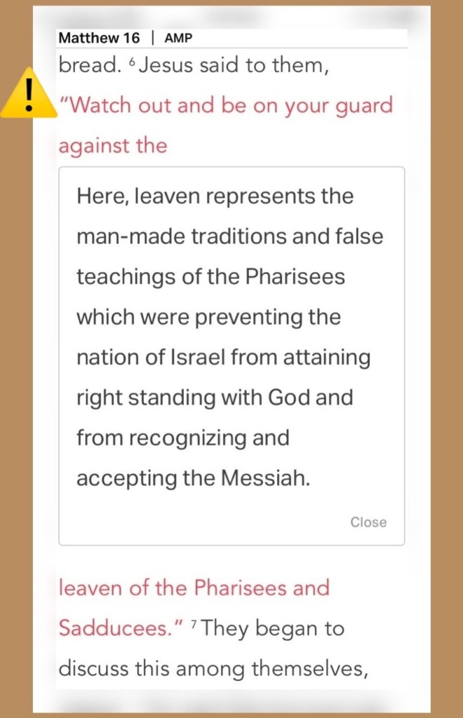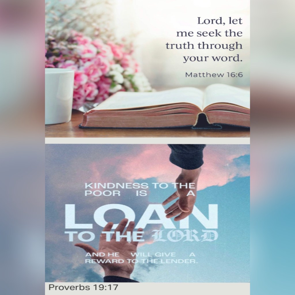 “Jesus said to them, “Watch out and be on your guard against the leaven of the Pharisees and Sadducees.””Matthew 16:6 AMP. “He who is gracious and lends a hand to the poor lends to The Lord, And The Lord will repay him for his good deed.” Proverbs 19:17 AMP