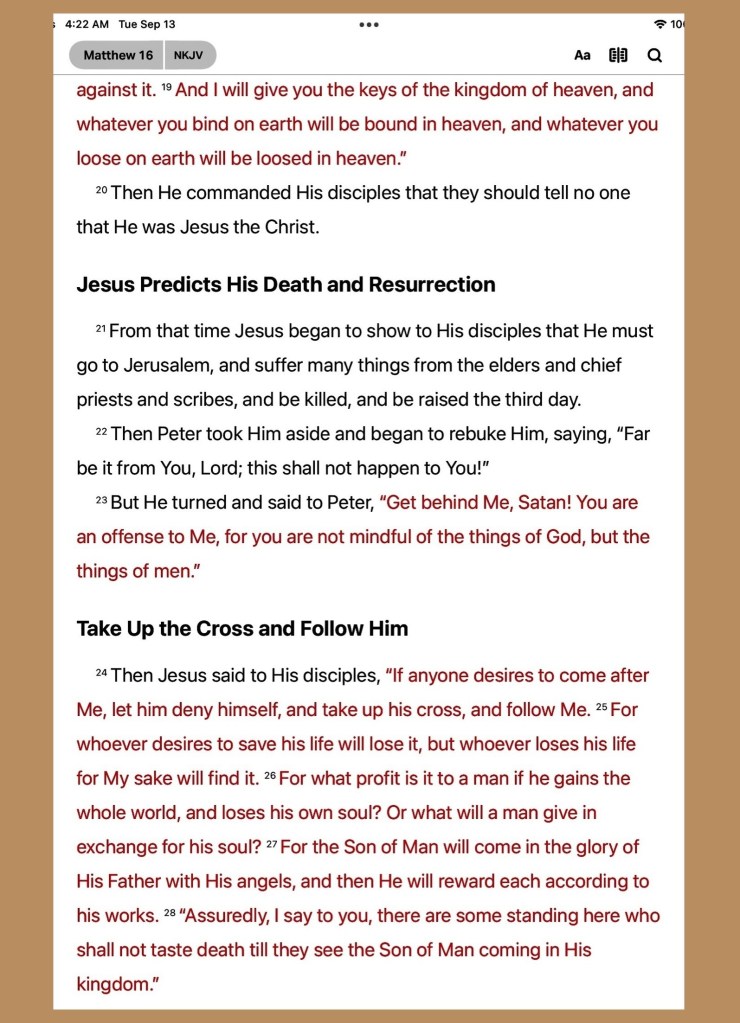 The signs of the times in our own day are much as they were in that. Still men are lovers of pleasure rather than of God. Still they who will live a godly life must be prepared to suffer persecution. The forms of hatred and dislike of the gospel change, but the hatred of the Cross is as inveterate as ever. The sign of Jonah was his resurrection to take up his cry against Nineveh; the resurrection of Jesus is the Father’s seal of endorsement. See to it that He shall rise, not only in Joseph’s garden, but in thy heart! That is the best evidence of the truth of our holy faith. There is abroad today much teaching which may be compared to leaven. The germs of hurtful and false doctrine are as thick as microbes. Propagated by the agencies of the spoken address and the written page, they produce fermentation and unrest in the young and unstable. We must judge these pernicious teachings, not by their pleasant and innocent appearance, but by their effect on heart and character. E-Sword