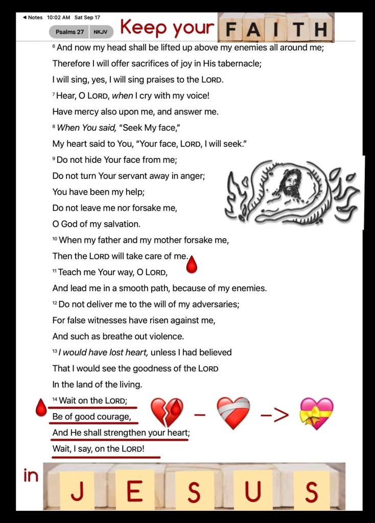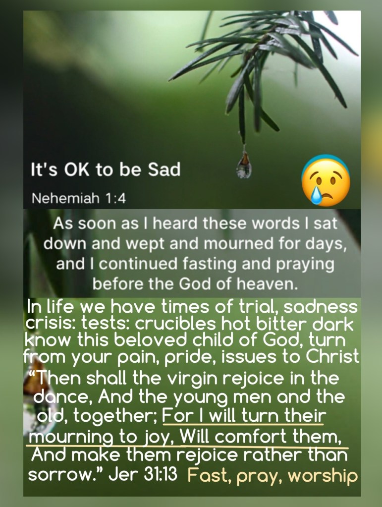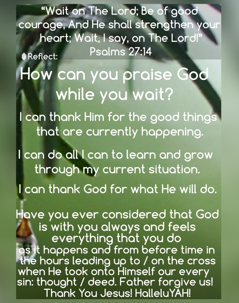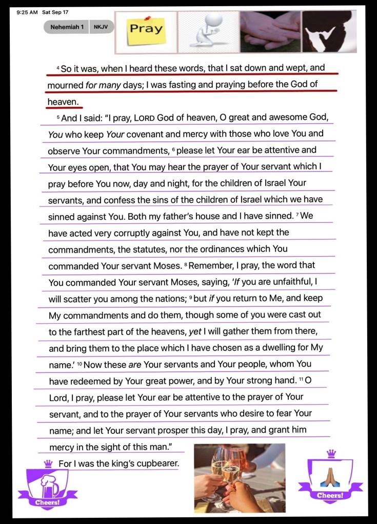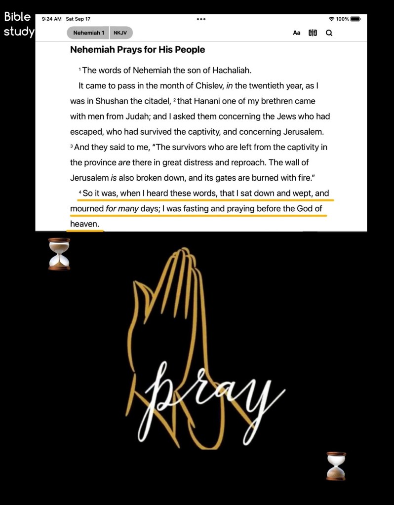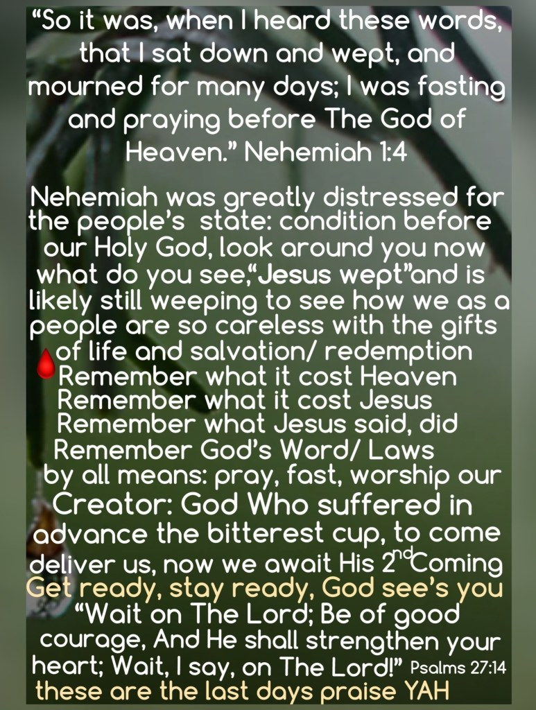 “So it was, when I heard these words, that I sat down and wept, and mourned for many days; I was fasting and praying before The God of Heaven.” Nehemiah 1:4 “Wait on The Lord; Be of good courage, And He shall strengthen your heart; Wait, I say, on The Lord!” Psalms 27:14