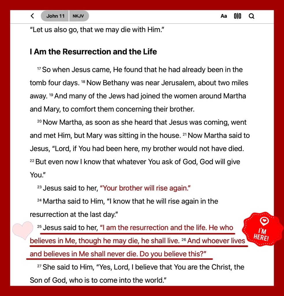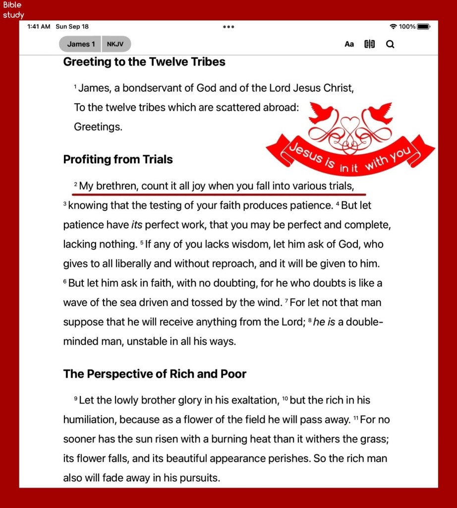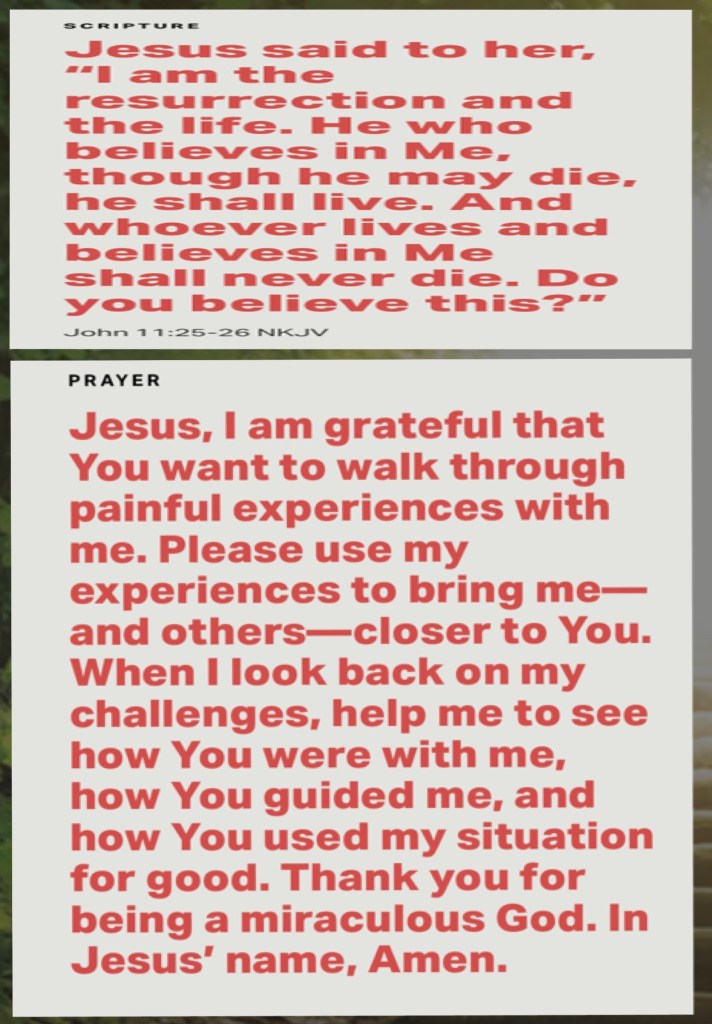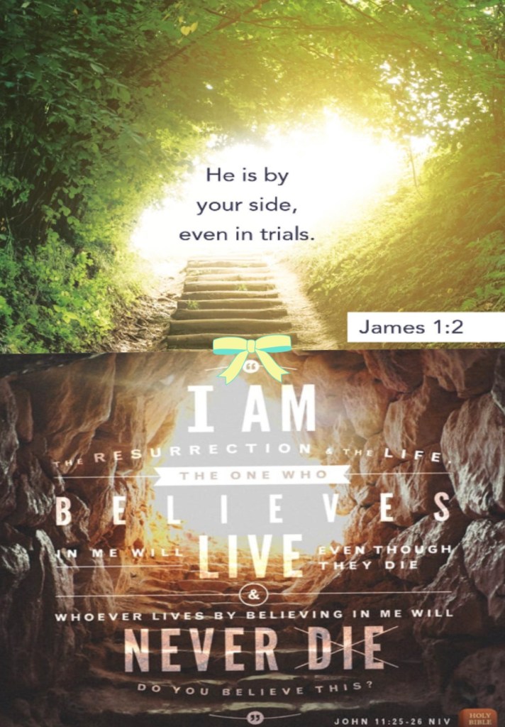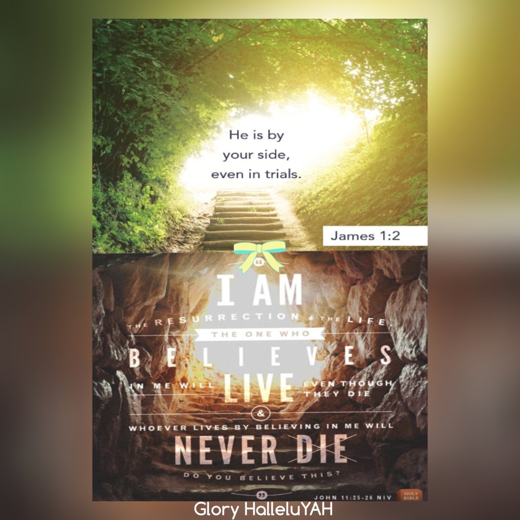 “Consider it nothing but joy, my brothers and sisters, whenever you fall into various trials.” James 1:2 AMP “Jesus said to her, “I am the Resurrection and the Life. Whoever believes in (adheres to, trusts in, relies on) Me [as Savior] will live even if he dies; and everyone who lives and believes in Me [as Savior] will never die. Do you believe this?”” John 11:25-26 AMP