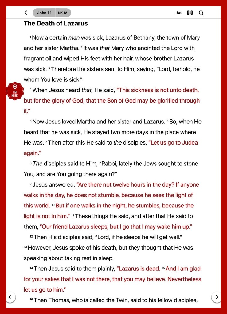 His step may linger, but Jesus comes at length. While He seems to tarry, He knows each sigh, pang, and tear that escapes from the sufferer and His friends; and when He arrives He does more than we asked or thought. He raises not the sick, but the dead. He makes the darkness of the tomb the background to set forth the resurrection glory. He turns tears into jewels, as the sun does with dewdrops. In after days the three would not have wished it otherwise. They would review it all, as we shall our life from the hilltops of heavenly glory, with the cry of “Amen, Hallelujah.” Amen, the reverent assent of the will. Hallelujah, the glad ascription of praise, Joh 11:25. If we die before His second advent, we shall still live; if we live to see it, we shall be changed in a moment into His likeness. Note that majestic consciousness of I AM, Joh 11:25. None ever spoke like this. It is the crown of the eight I AMs of this Gospel. He is unchangeably the same. All who have lived are living still in Him. When you stand by the grave where your cherished hopes lie buried, still dare to affirm that He is the Christ, the expression of the love of God. E-Sword