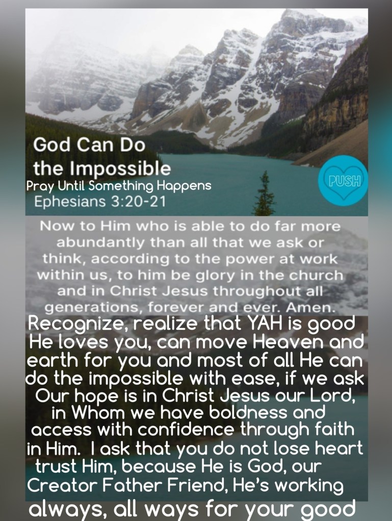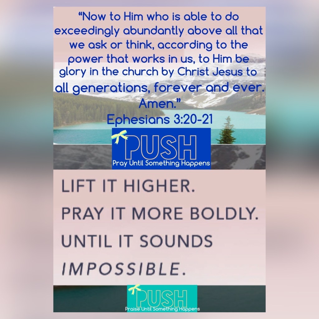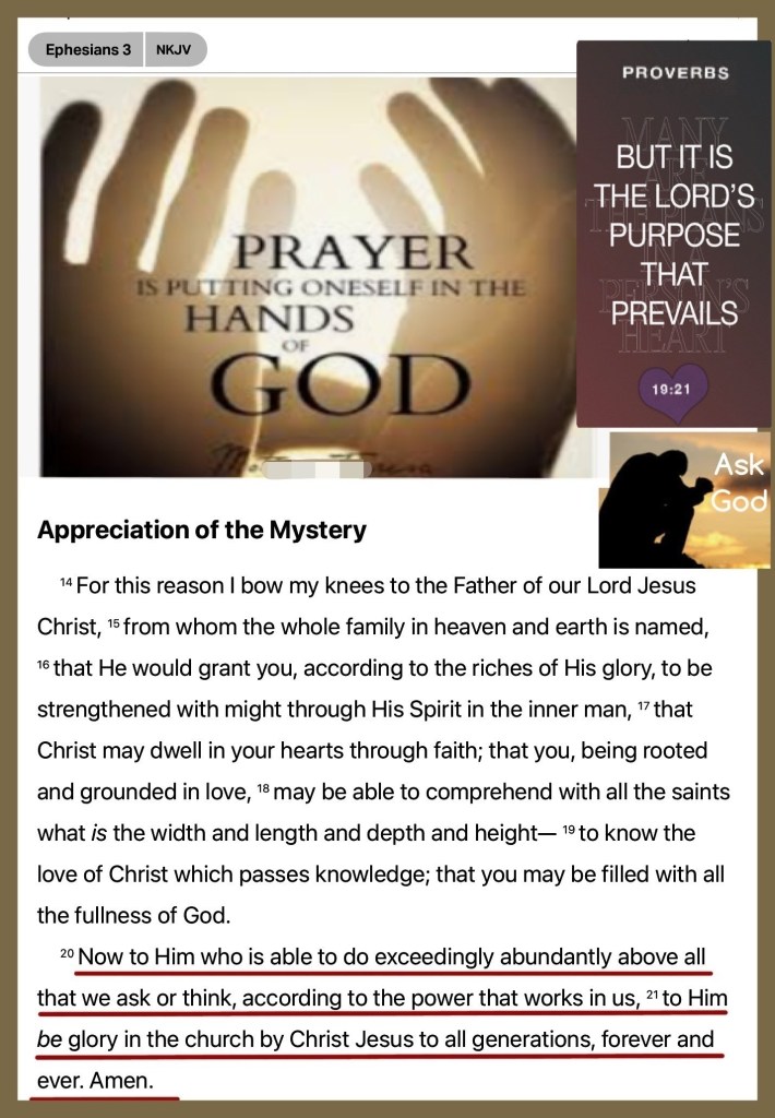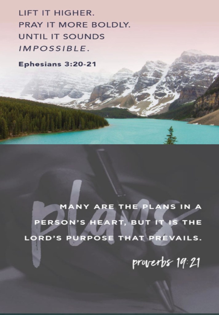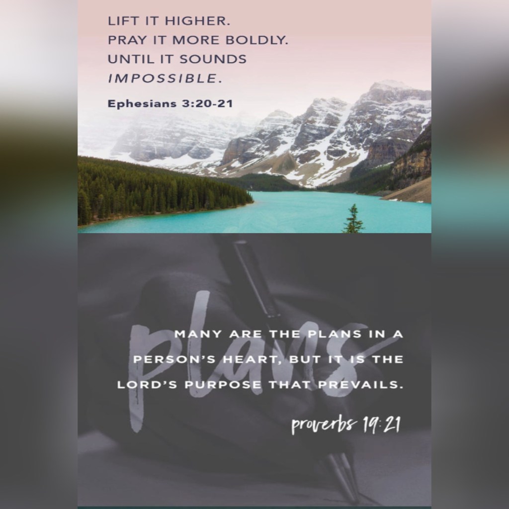 “Now to Him who is able to [carry out His purpose and] do superabundantly more than all that we dare ask or think [infinitely beyond our greatest prayers, hopes, or dreams], according to His power that is at work within us, to Him be the glory in the church and in Christ Jesus throughout all generations forever and ever. Amen.” Ephesians 3:20-21 AMP “Many plans are in a man’s mind, But it is The Lord’s purpose for him that will stand (be carried out).” Proverbs 19:21 AMP