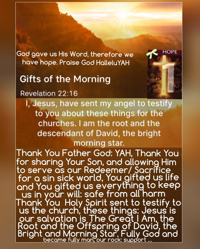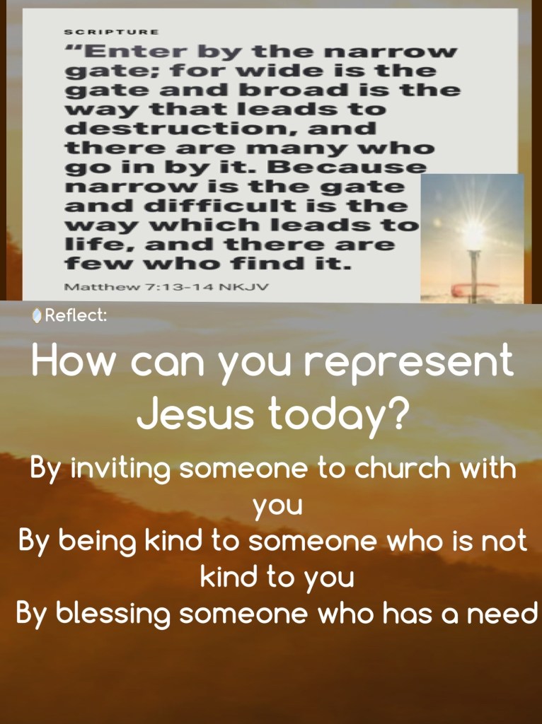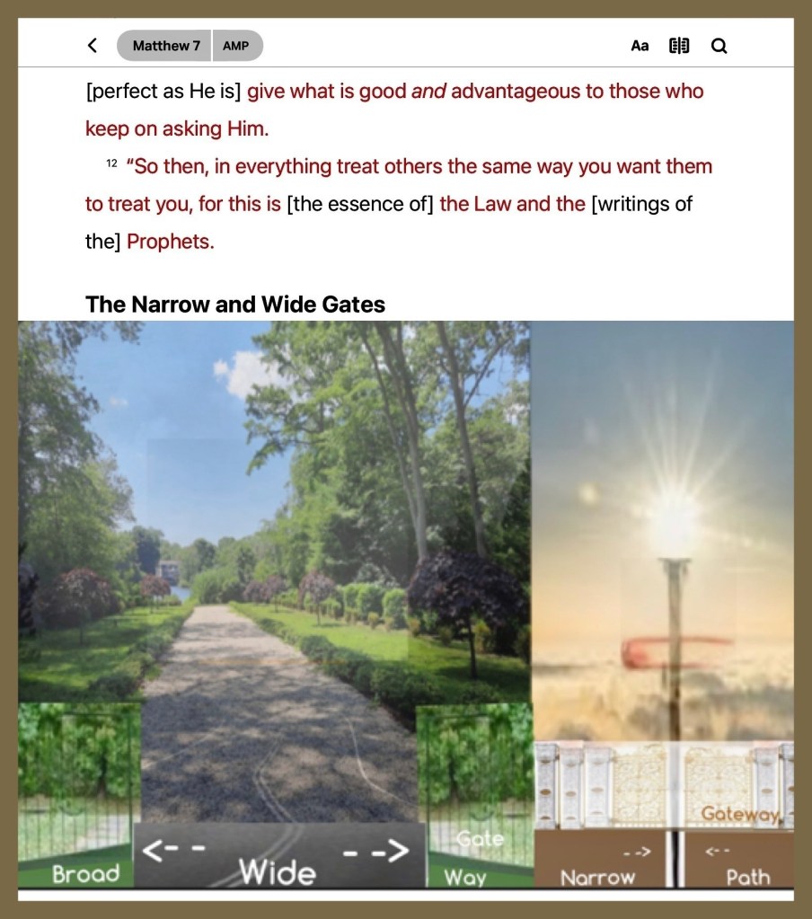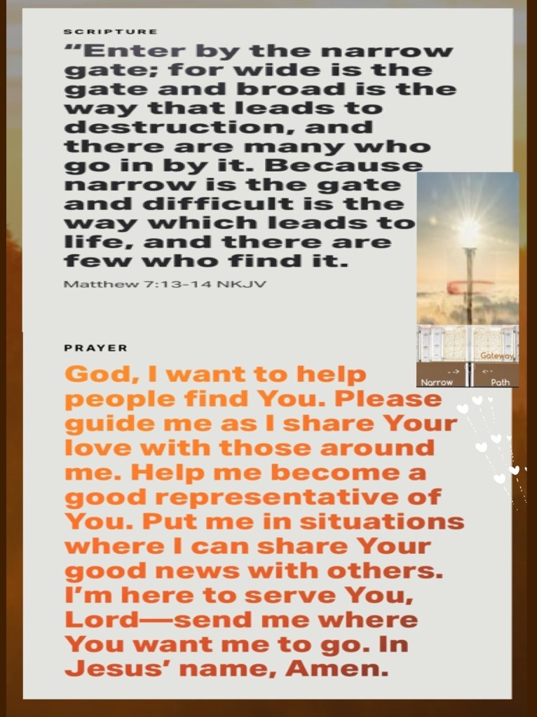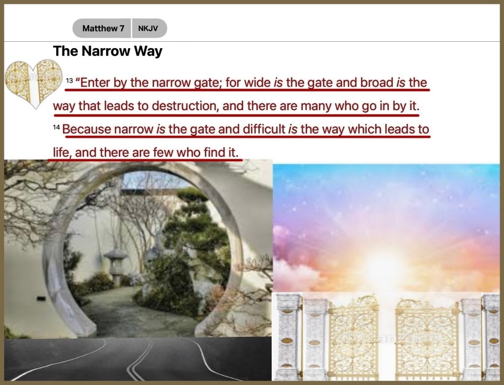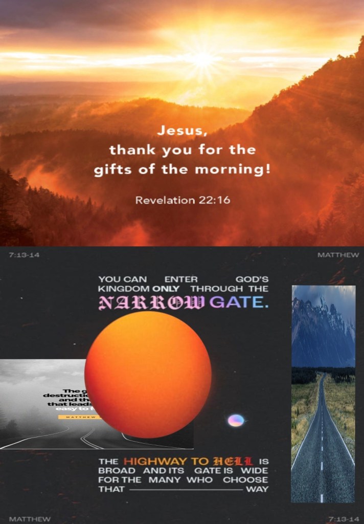 ““I, Jesus, have sent My angel to testify to you and to give you assurance of these things for the churches. I am the Root (the Source, the Life) and the Offspring of David, the radiant and bright Morning Star.”” Revelation 22:16 AMP ““Enter through the narrow gate. For wide is the gate and broad and easy to travel is the path that leads the way to destruction and eternal loss, and there are many who enter through it. But small is the gate and narrow and difficult to travel is the path that leads the way to [everlasting] life, and there are few who find it.”Matthew 7:13-14 AMP