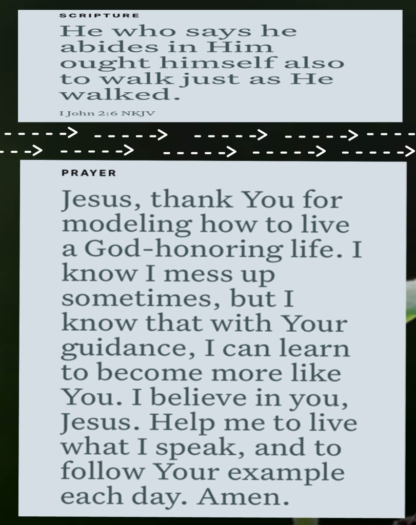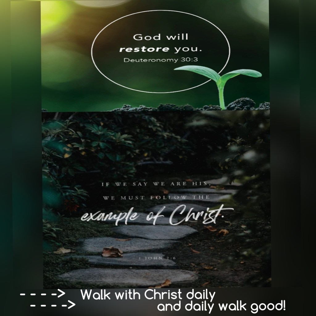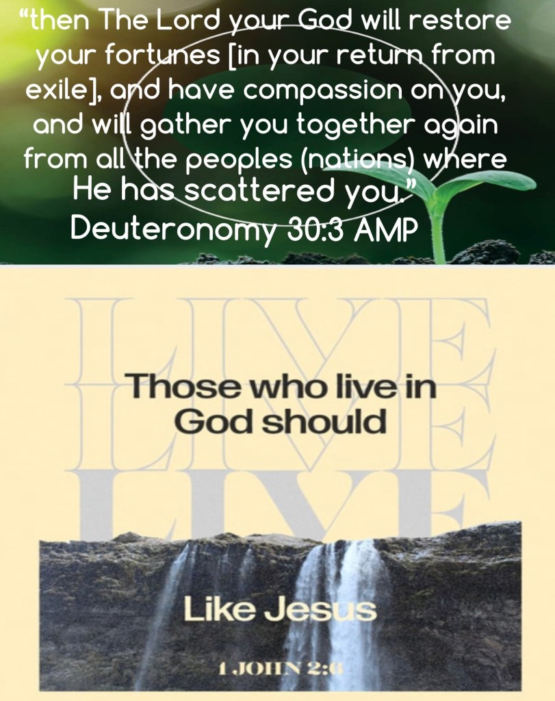 “then The Lord your God will restore your fortunes [in your return from exile], and have compassion on you, and will gather you together again from all the peoples (nations) where He has scattered you.” Deuteronomy 30:3 AMP “whoever says he lives in Christ [that is, whoever says he has accepted Him as God and Savior] ought [as a moral obligation] to walk and conduct himself just as He walked and conducted Himself.” 1 John 2:6 AMP