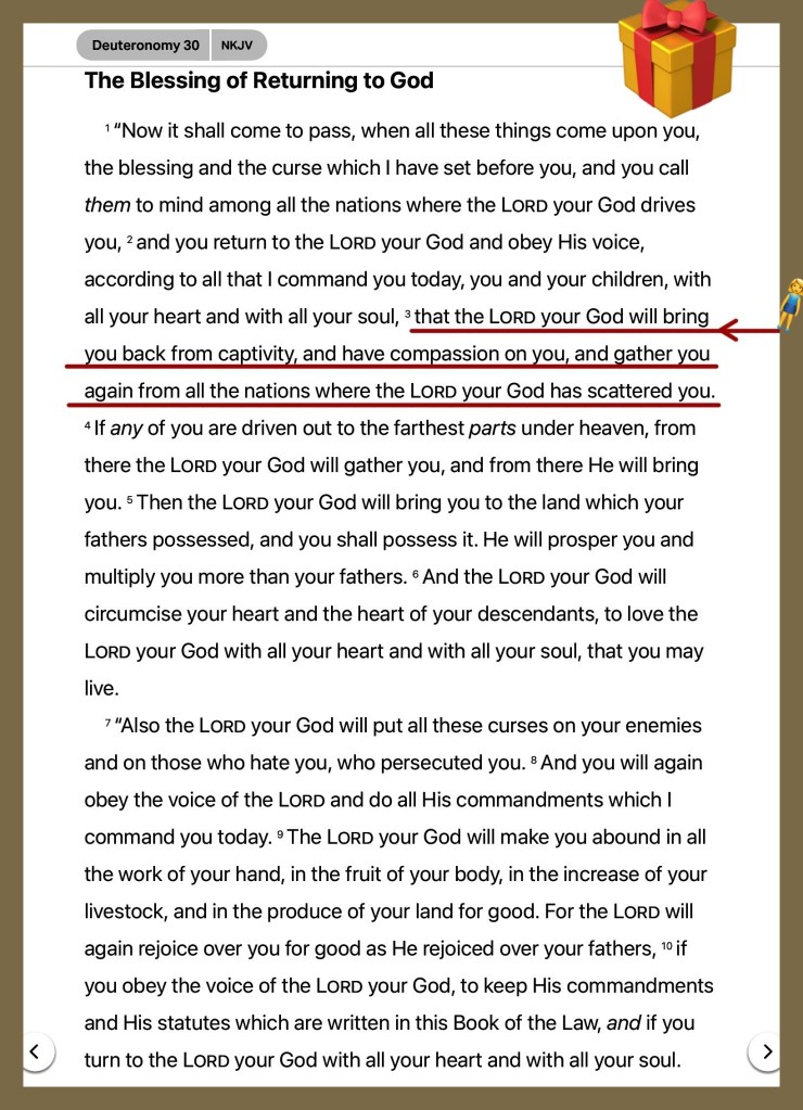 Deu 30:3 That then the LORD thy God will turn thy captivity, and have compassion upon thee, and will return and gather thee from all the nations, whither the LORD thy God hath scattered thee.