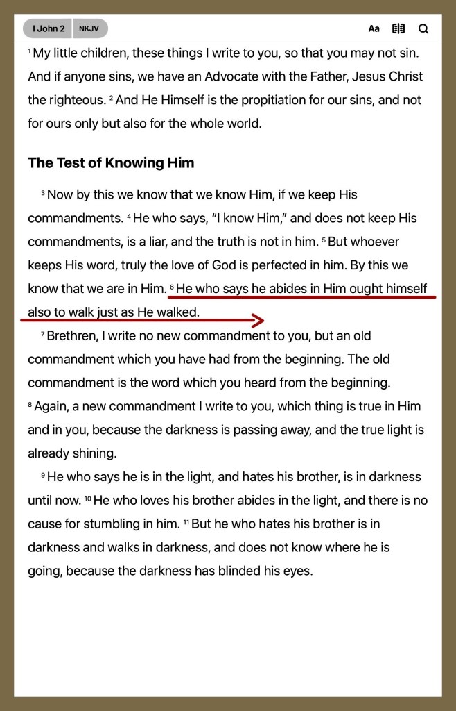 1Jn 2:6 He that saith he abideth in him ought himself also so to walk, even as he walked.