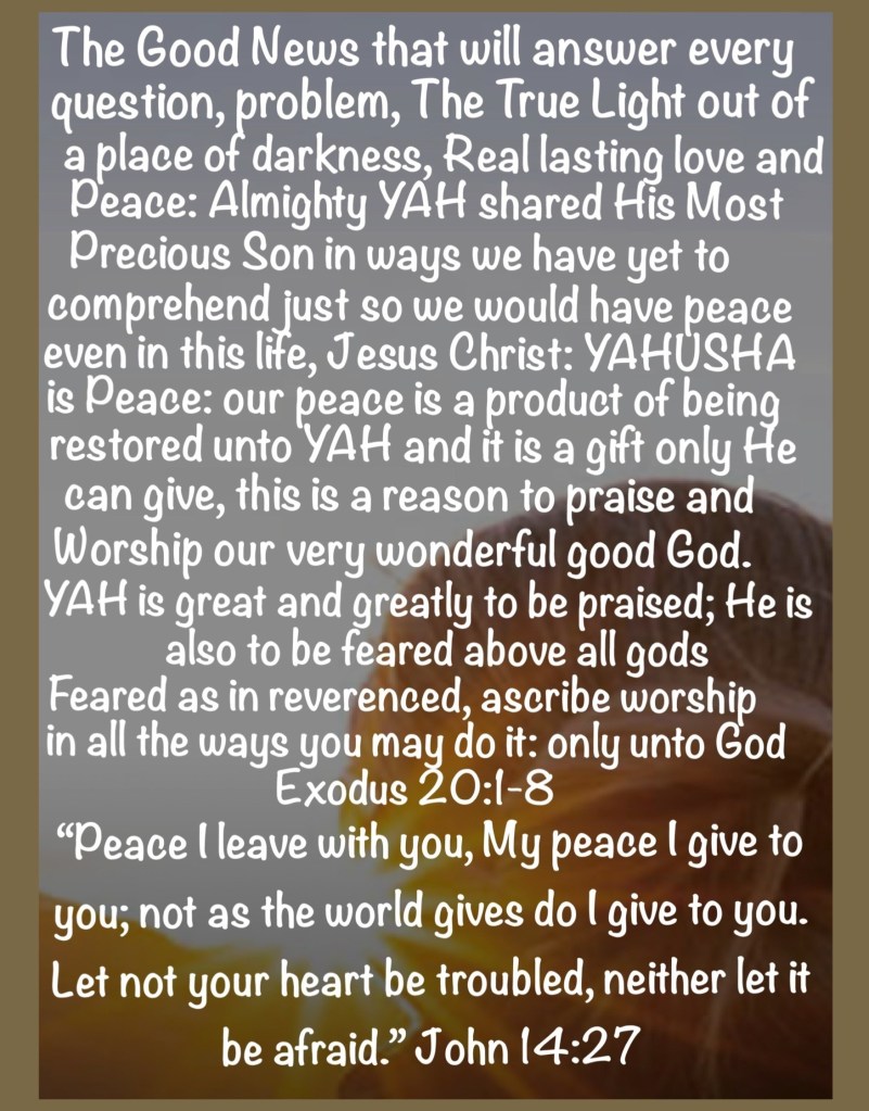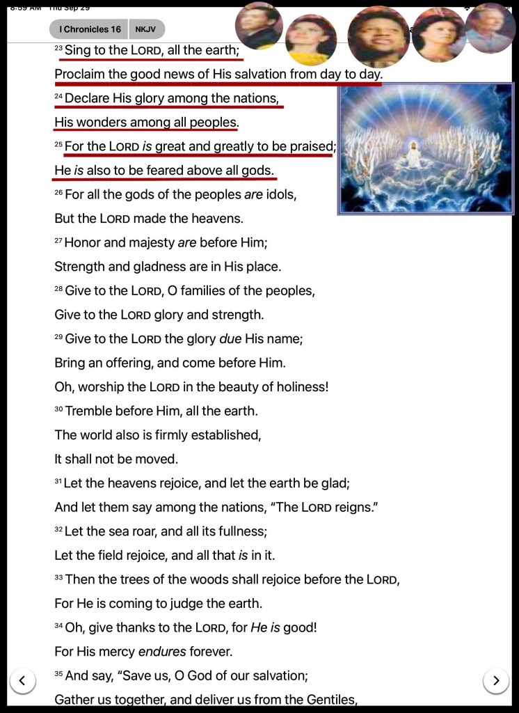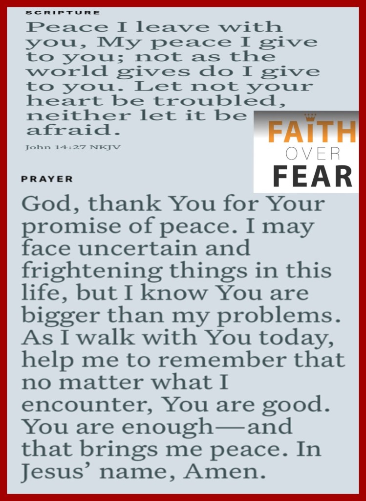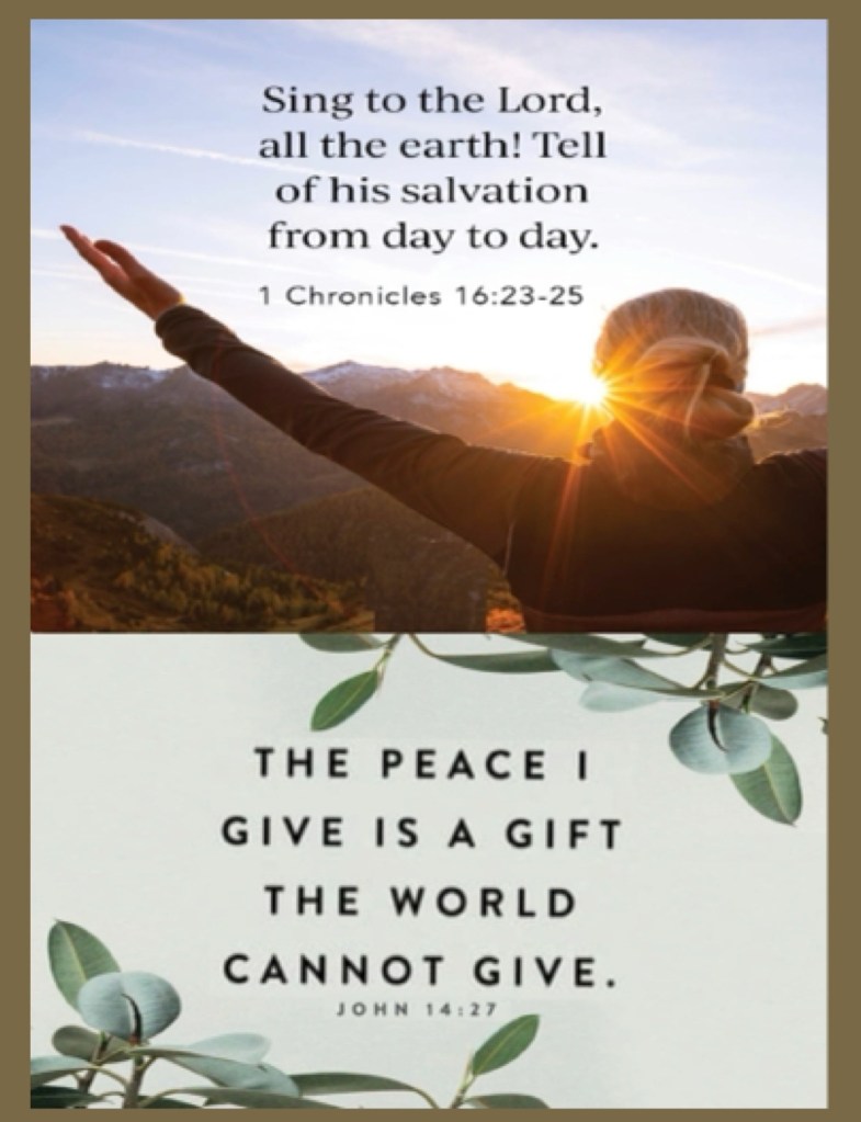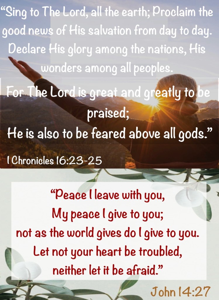 “Sing to The Lord, all the earth; Proclaim the good news of His salvation from day to day. Declare His glory among the nations, His wonders among all peoples. For The Lord is great and greatly to be praised; He is also to be feared above all gods.”1 Chronicles 16:23-25 “Peace I leave with you, My peace I give to you; not as the world gives do I give to you. Let not your heart be troubled, neither let it be afraid.” John 14:27