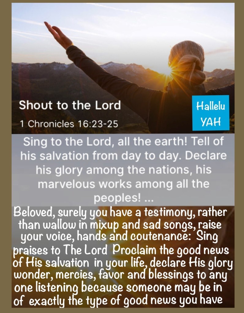 1Ch 16:23 Sing unto the LORD, all the earth; shew forth from day to day his salvation.