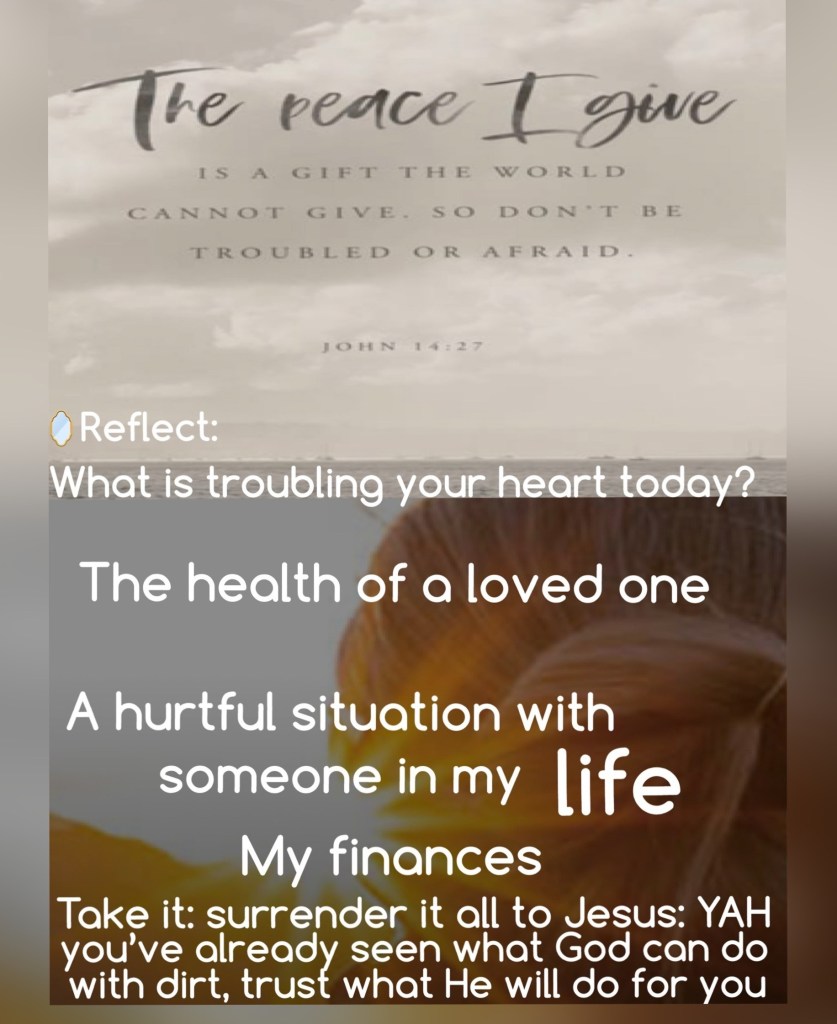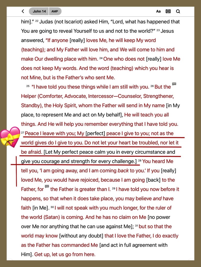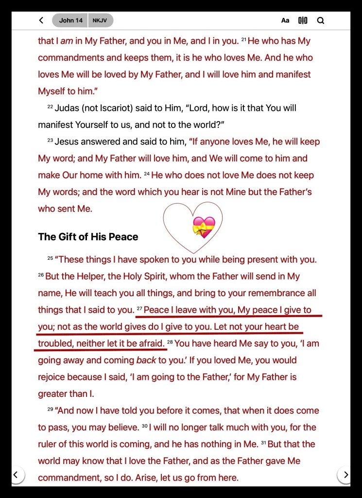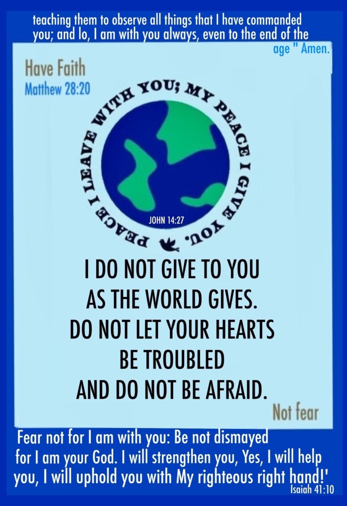 Joh 14:27 Peace I leave with you, my peace I give unto you: not as the world giveth, give I unto you. Let not your heart be troubled, neither let it be afraid.