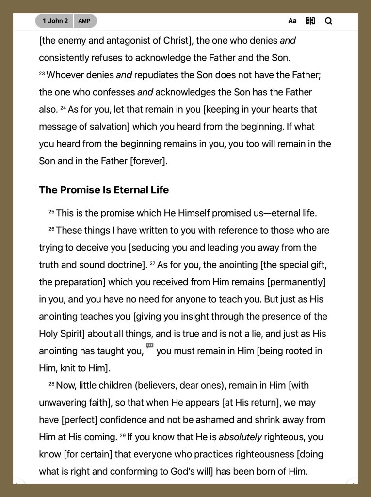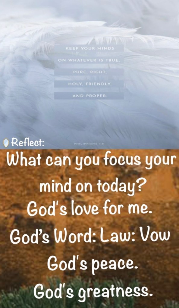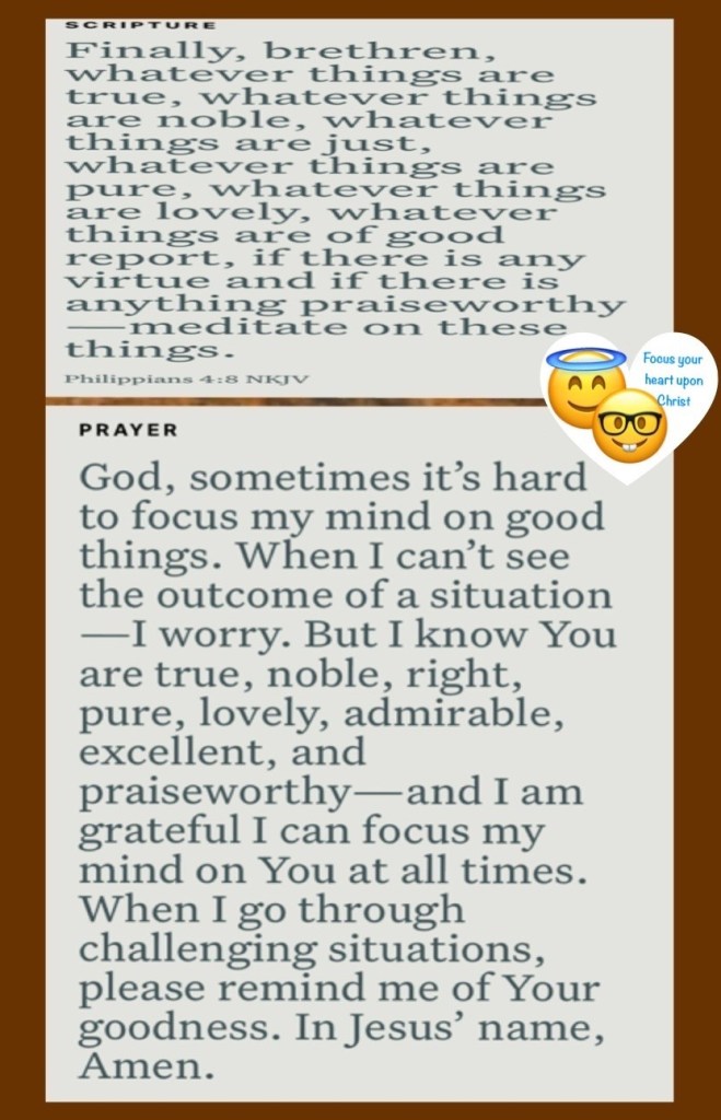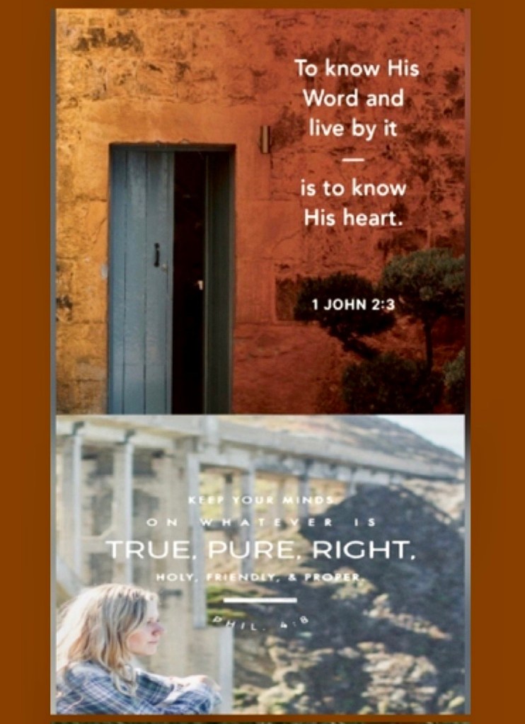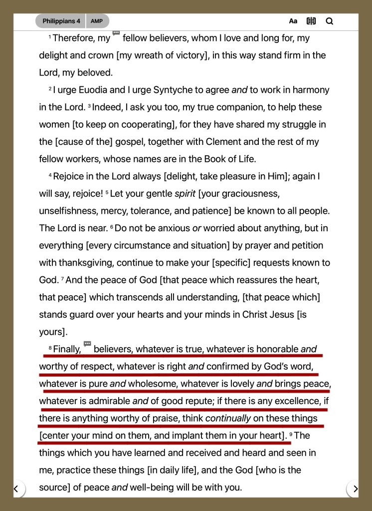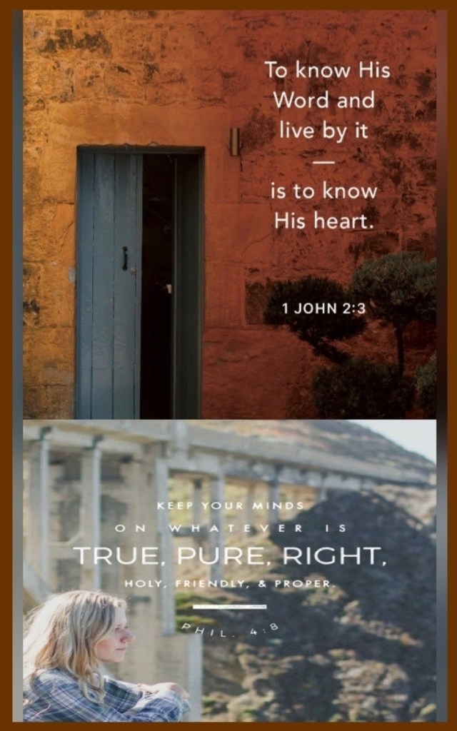 “And this is how we know [daily, by experience] that we have come to know Him [to understand Him and be more deeply acquainted with Him]: if we habitually keep [focused on His precepts and obey] His commandments (teachings).” 1 John 2:3 AMP “Finally, believers, whatever is true, whatever is honorable and worthy of respect, whatever is right and confirmed by God’s word, whatever is pure and wholesome, whatever is lovely and brings peace, whatever is admirable and of good repute; if there is any excellence, if there is anything worthy of praise, think continually on these things [center your mind on them, and implant them in your heart].” Philippians 4:8 AMP