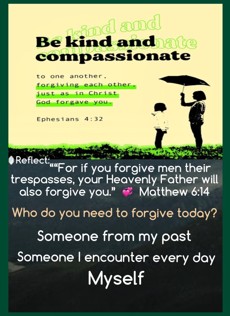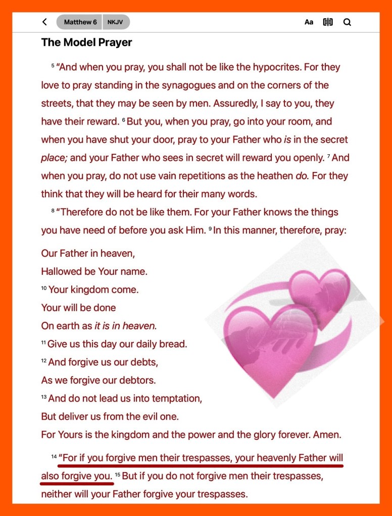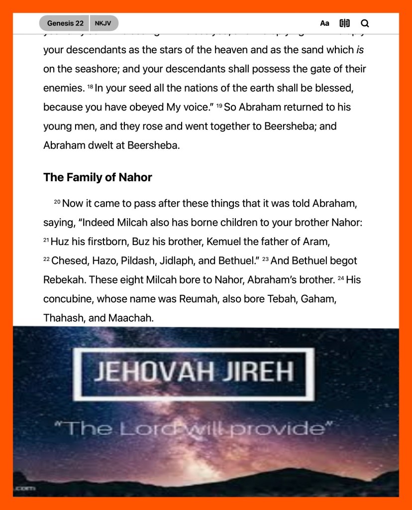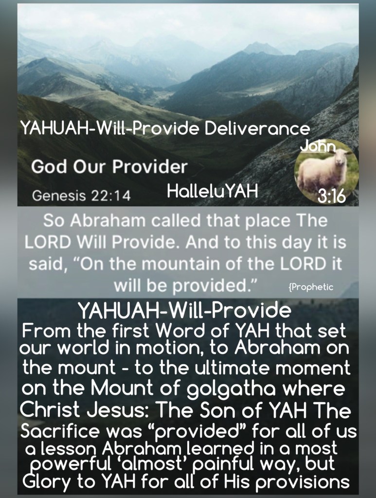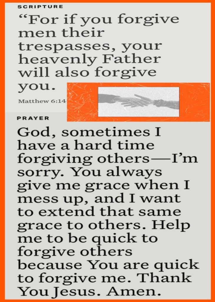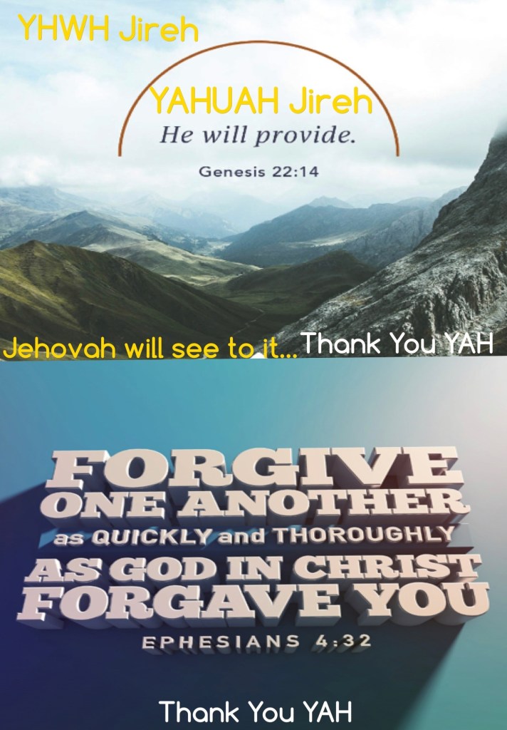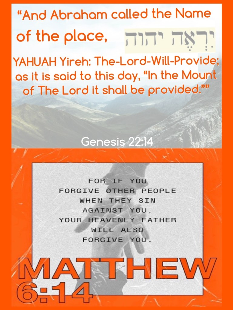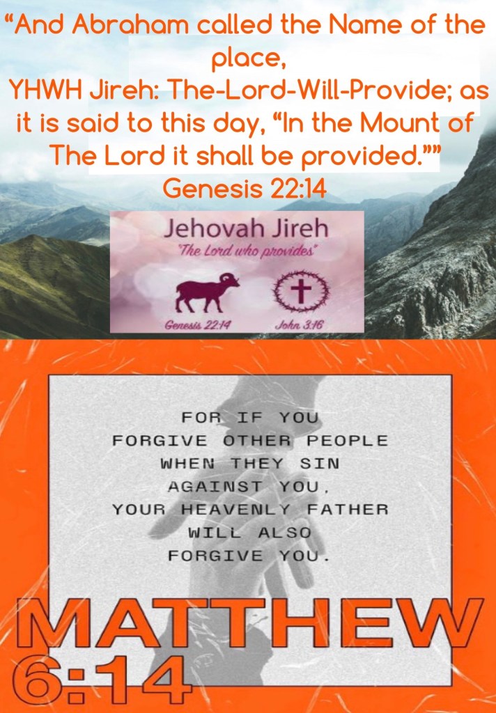 “So Abraham named that place The Lord Will Provide. And it is said to this day, “On the mountain of the Lord it will be seen and provided.”” Genesis 22:14 AMP “For if you forgive others their trespasses [their reckless and willful sins], your heavenly Father will also forgive you.” Matthew 6:14 AMP