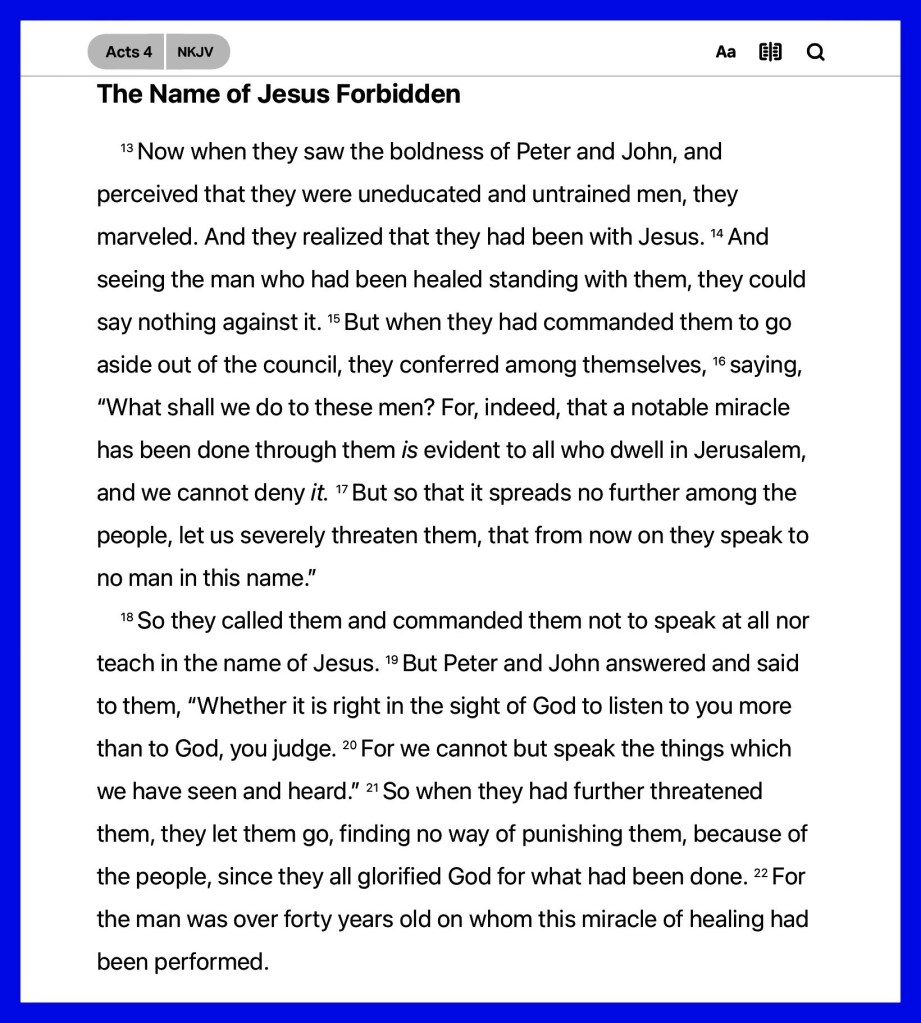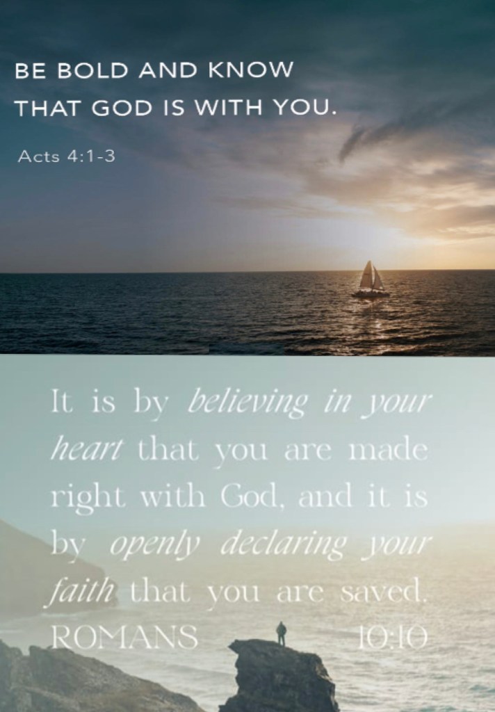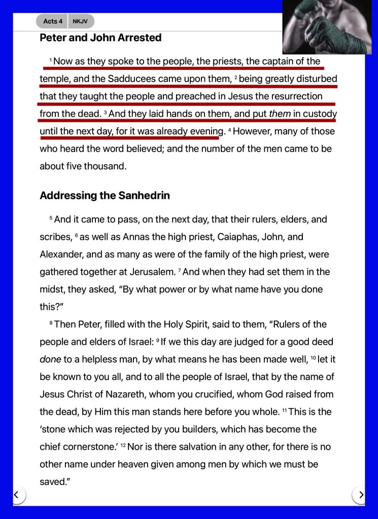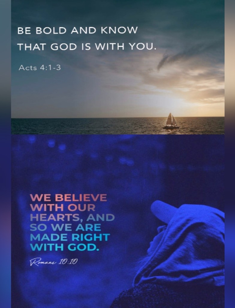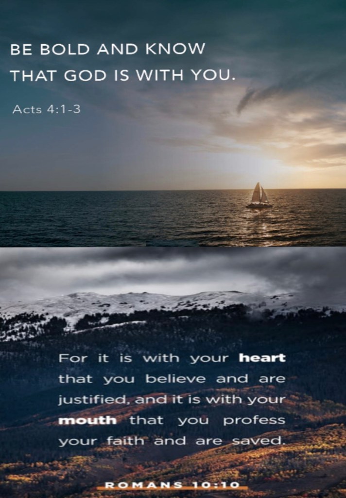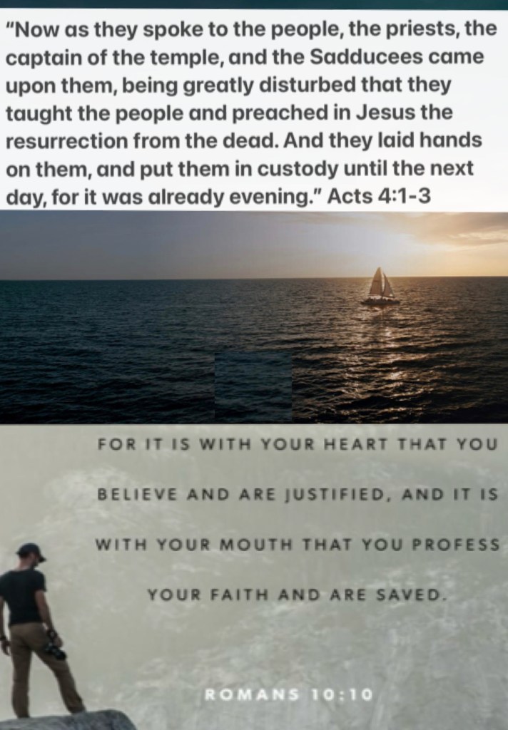 “And while Peter and John were talking to the people, the priests and the captain [who was in charge of the temple area and] of the temple guard and the Sadducees came up to them, being extremely disturbed and thoroughly annoyed because they were teaching the people and proclaiming in [the case of] Jesus the resurrection of the dead. So they arrested them and put them in jail until the next day, because it was evening.” Acts 4:1-3 AMP “For with the heart a person believes [in Christ as Savior] resulting in his justification [that is, being made righteous—being freed of the guilt of sin and made acceptable to God]; and with the mouth he acknowledges and confesses [his faith openly], resulting in and confirming [his] salvation.” Romans 10:10 AMP