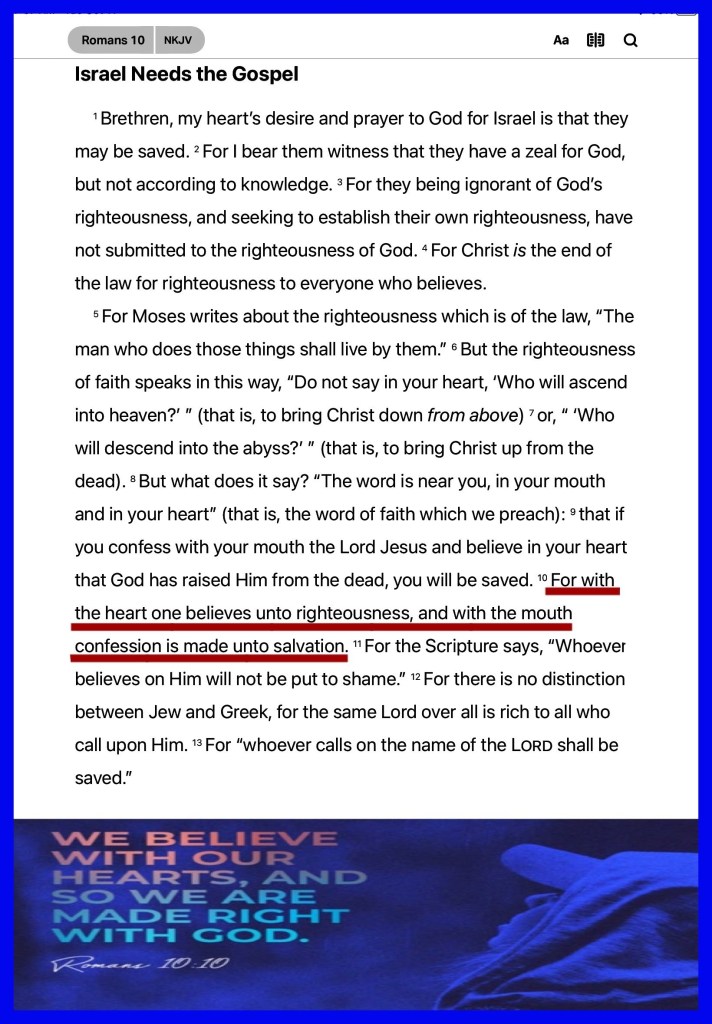 Rom 10:10 For with the heart man believeth unto righteousness; and with the mouth confession is made unto salvation.