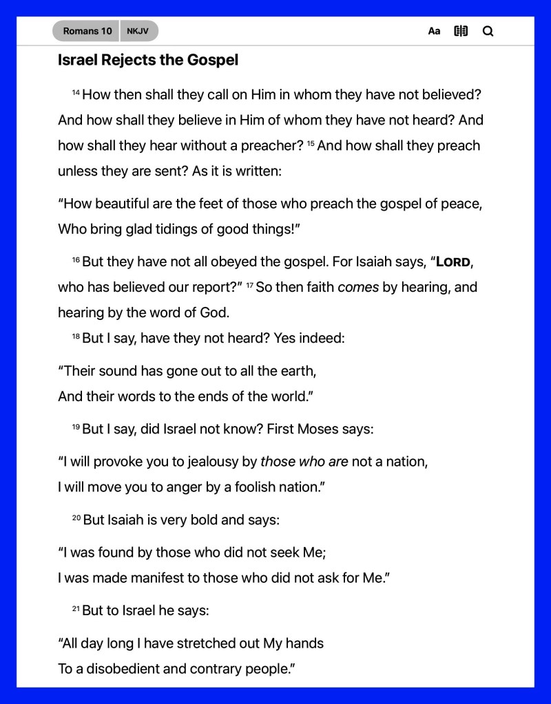 How earnestly the Apostle loved his own people! All their hatred of him could not extinguish the passionate devotion which he entertained for them. “Apostle to the Gentiles” he might be, but he was essentially an Israelite, of the seed of Abraham, of the tribe of Benjamin, Rom 11:1. The whole reason of their rejection of the gospel lay in their inveterate refusal to submit, Rom 10:3. Is not that the difficulty with us all? It is not that we cannot believe, but that we will not submit to God’s way of righteousness, so humbling is it to our pride. If only God would allow us to scale the heights or plumb the depths, to do some great thing, to make some vast sacrifice, we should be satisfied to be saved, and His help in the process would not be resented. But it is intolerable to our proud hearts to be told that our own efforts are useless, and that the exclusive source of salvation is God’s grace. Notice the distinction between righteousness and salvation, Rom 10:9. The one is objective; the other subjective. The first, our standing before God, the latter, the sanctification of our inner life, which not only depends upon the belief of the heart, but requires the confession that Jesus Christ has become Lord and King of the whole nature. E-Sword