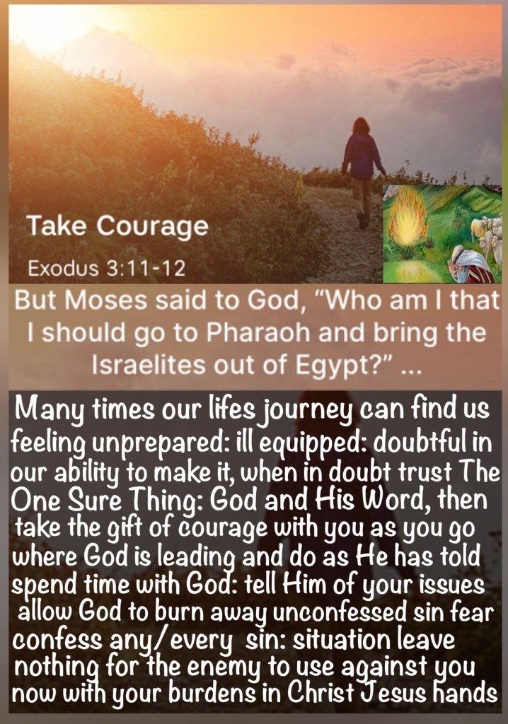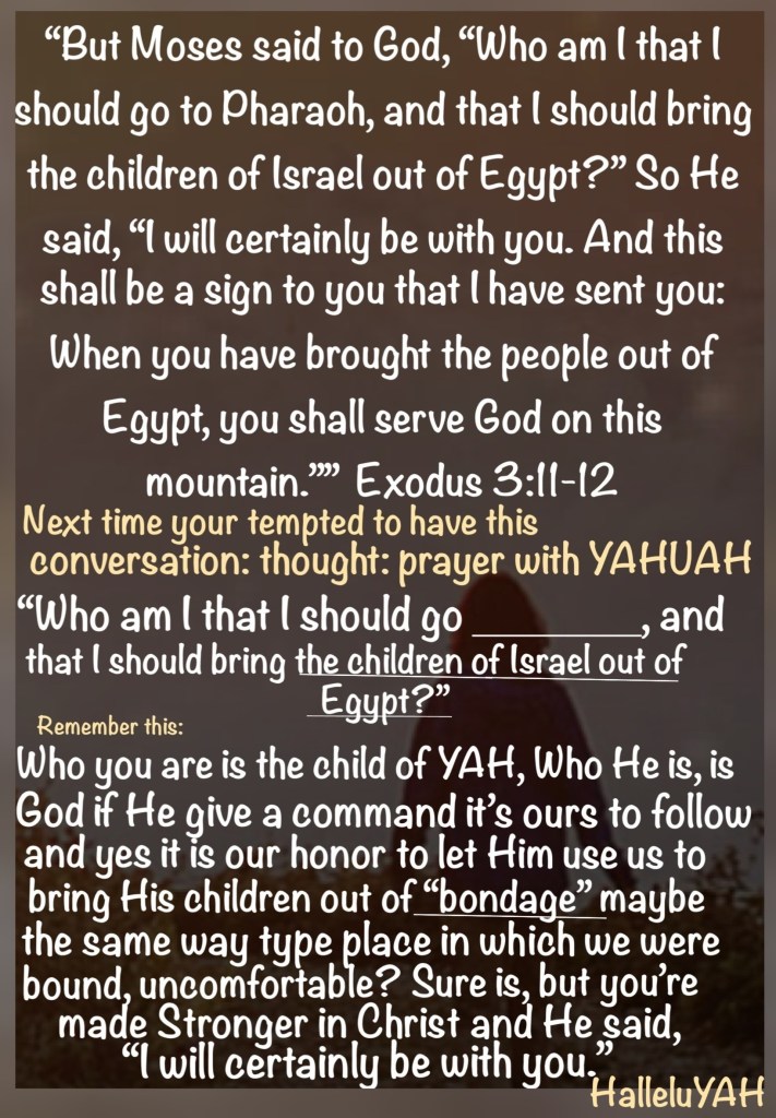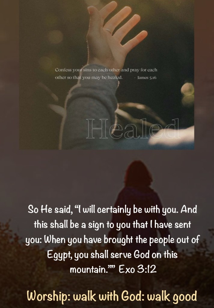 “But Moses said to God, “Who am I that I should go to Pharaoh, and that I should bring the children of Israel out of Egypt?” So He said, “I will certainly be with you. And this shall be a sign to you that I have sent you: When you have brought the people out of Egypt, you shall serve God on this mountain.”” Exodus 3:11-12 “Confess your trespasses to one another, and pray for one another, that you may be healed. The effective, fervent prayer of a righteous man avails much.” James 5:16