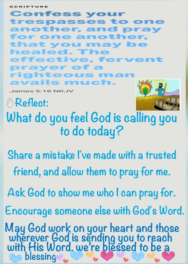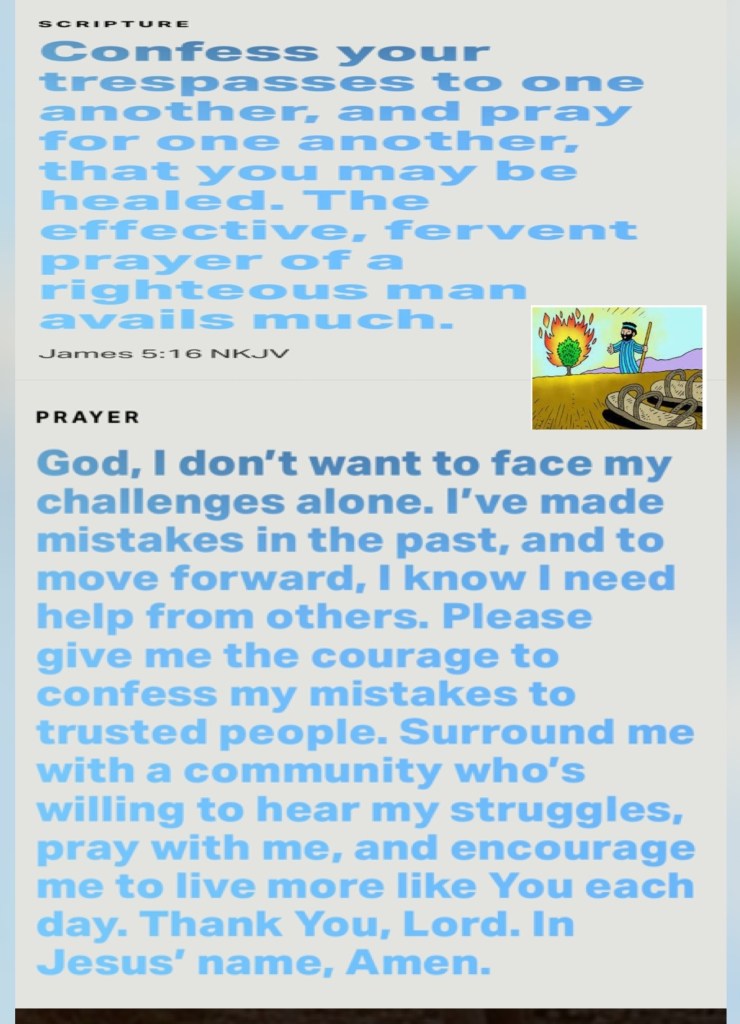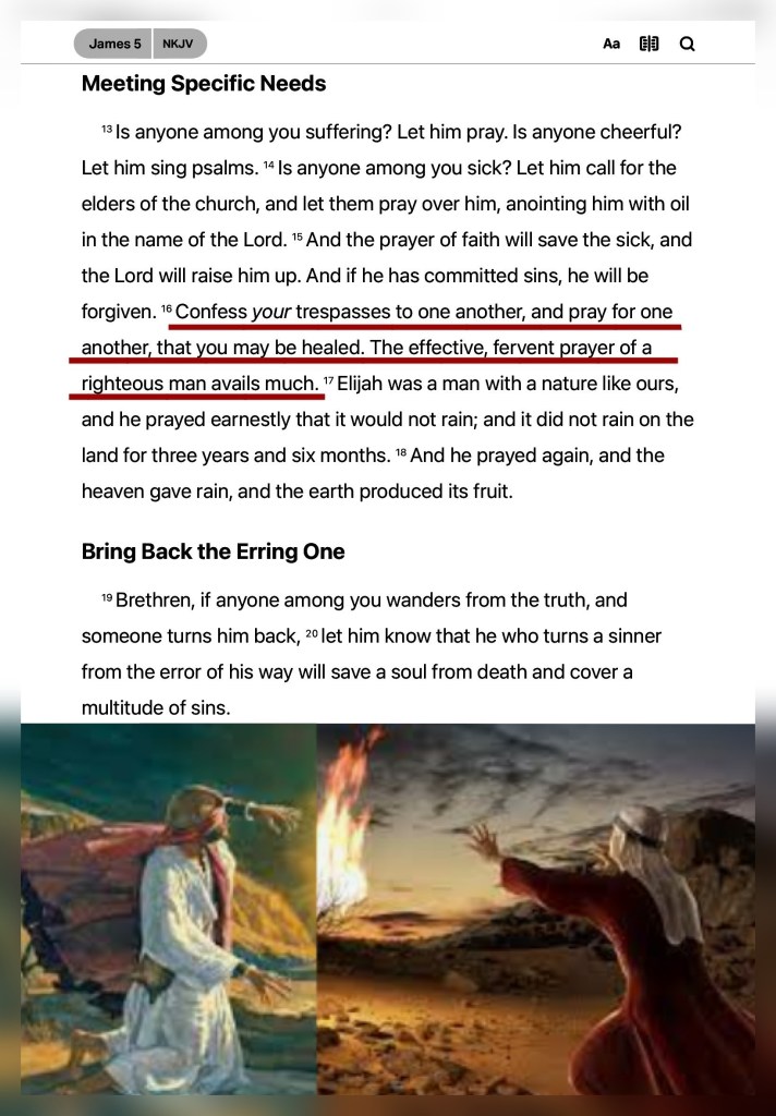 Jas 5:16 Confess your faults one to another, and pray one for another, that ye may be healed. The effectual fervent prayer of a righteous man availeth much.