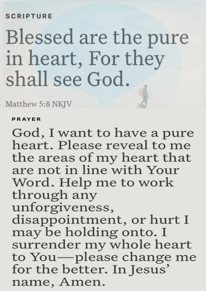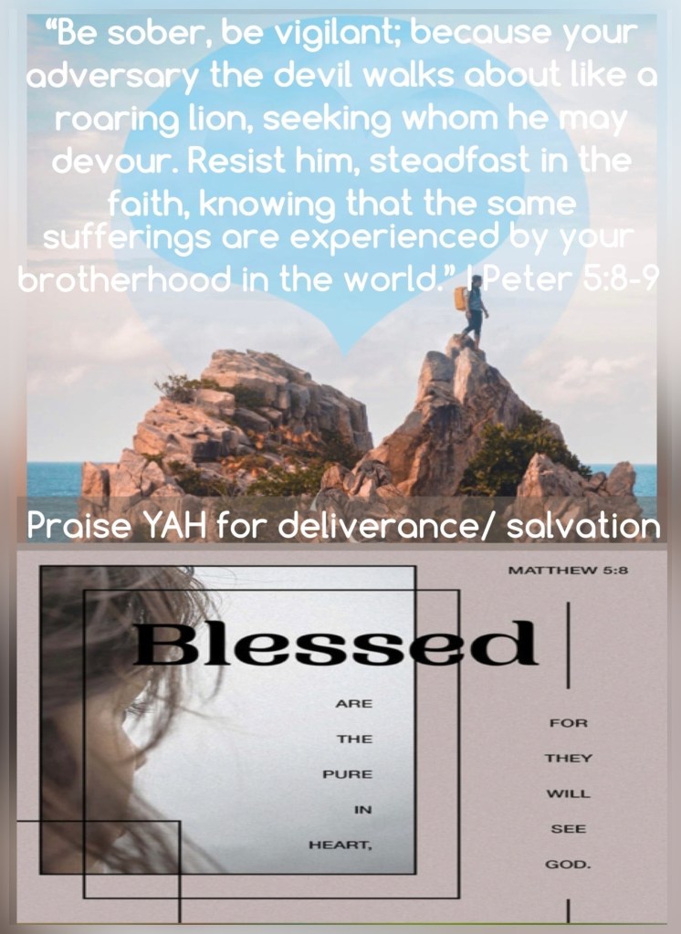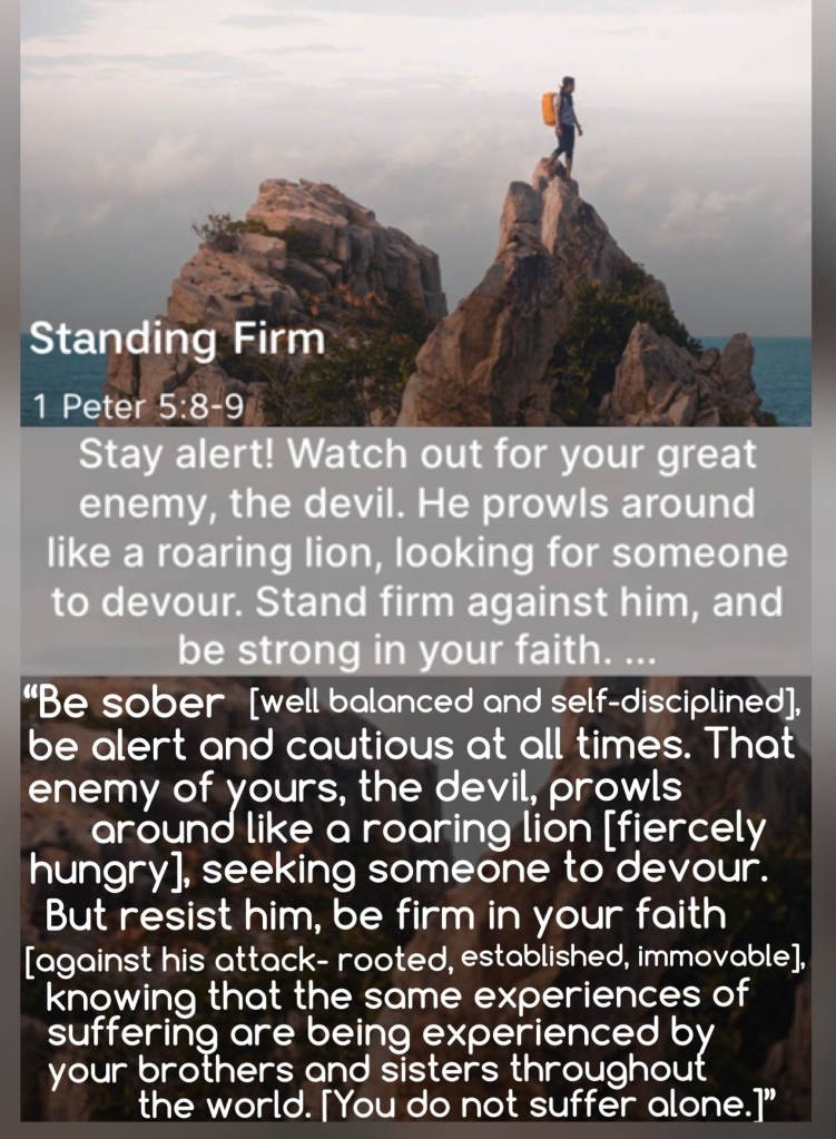 “Be sober [well balanced and self-disciplined], be alert and cautious at all times. That enemy of yours, the devil, prowls around like a roaring lion [fiercely hungry], seeking someone to devour. But resist him, be firm in your faith [against his attack—rooted, established, immovable], knowing that the same experiences of suffering are being experienced by your brothers and sisters throughout the world. [You do not suffer alone.]” 1 Peter 5:8-9 AMP ““Blessed [anticipating God’s presence, spiritually mature] are the pure in heart [those with integrity, moral courage, and godly character], for they will see God.” Matthew 5:8 AMP