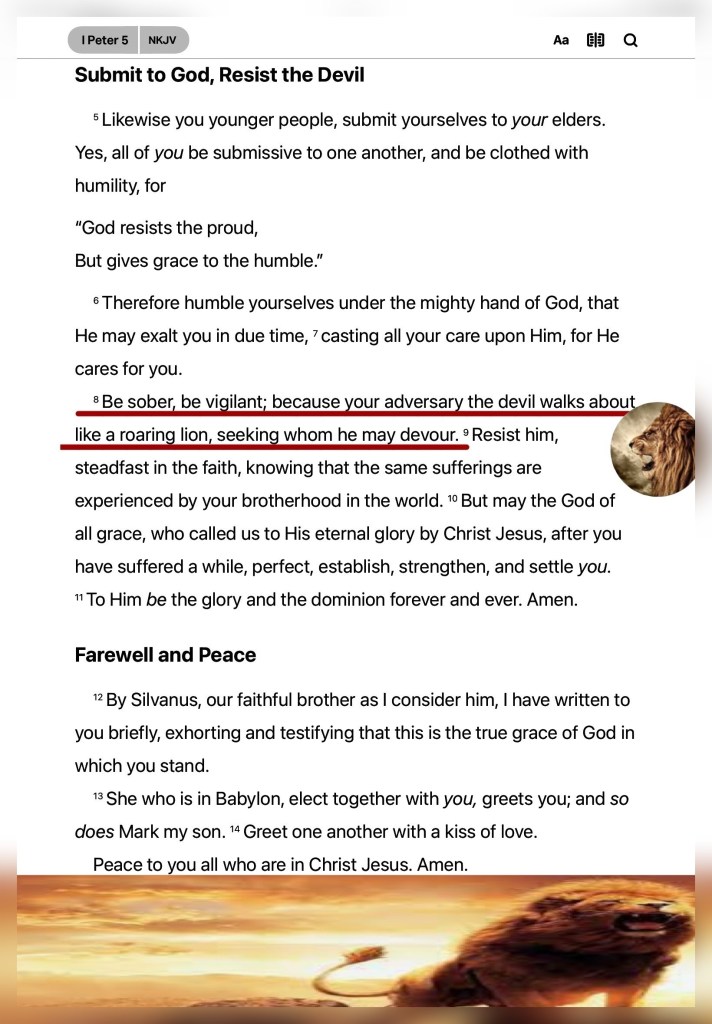 1Pe 5:8 Be sober, be vigilant; because your adversary the devil, as a roaring lion, walketh about, seeking whom he may devour: