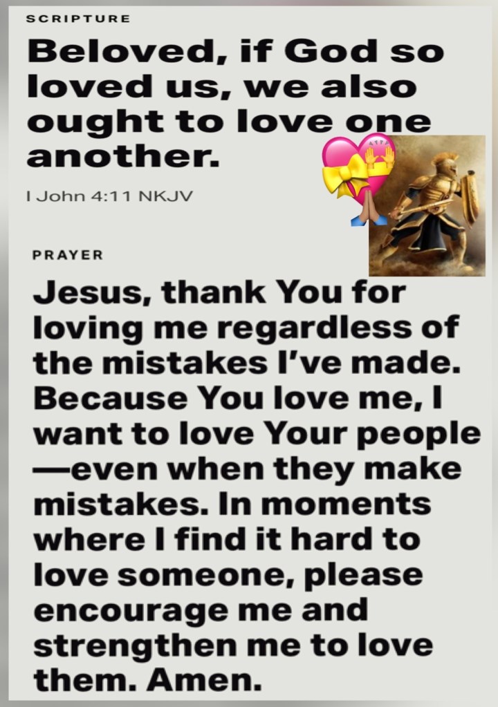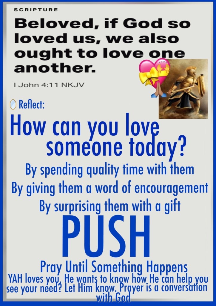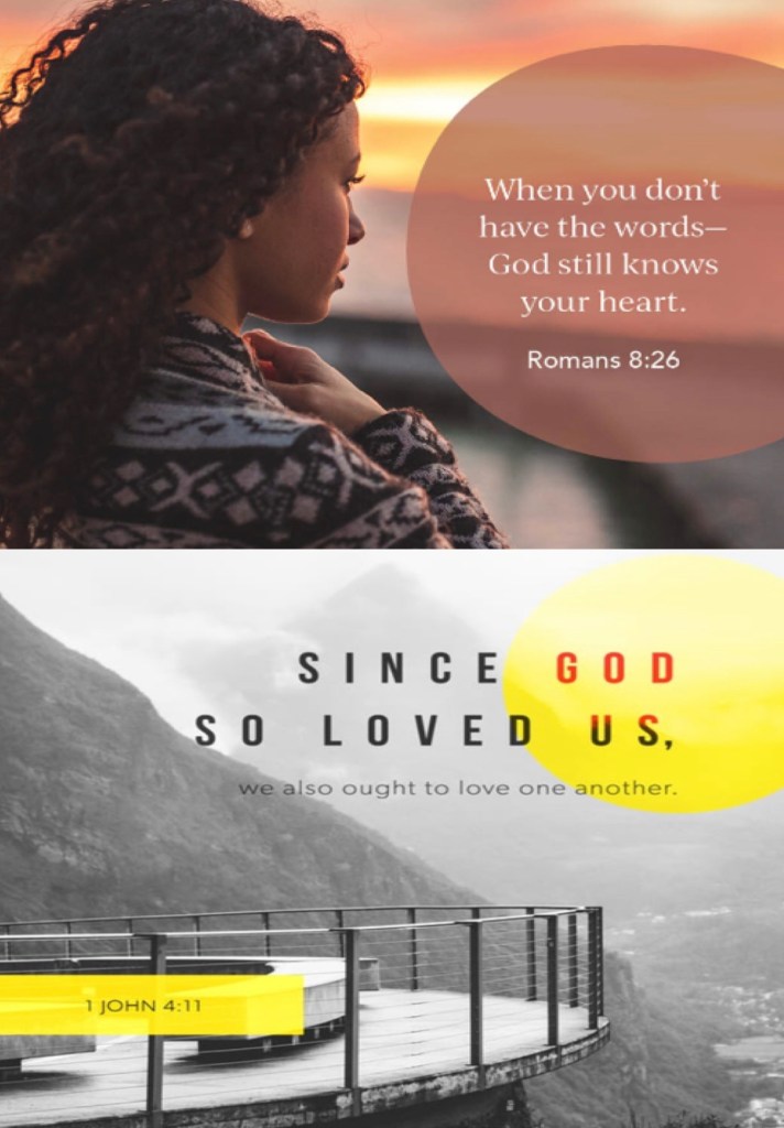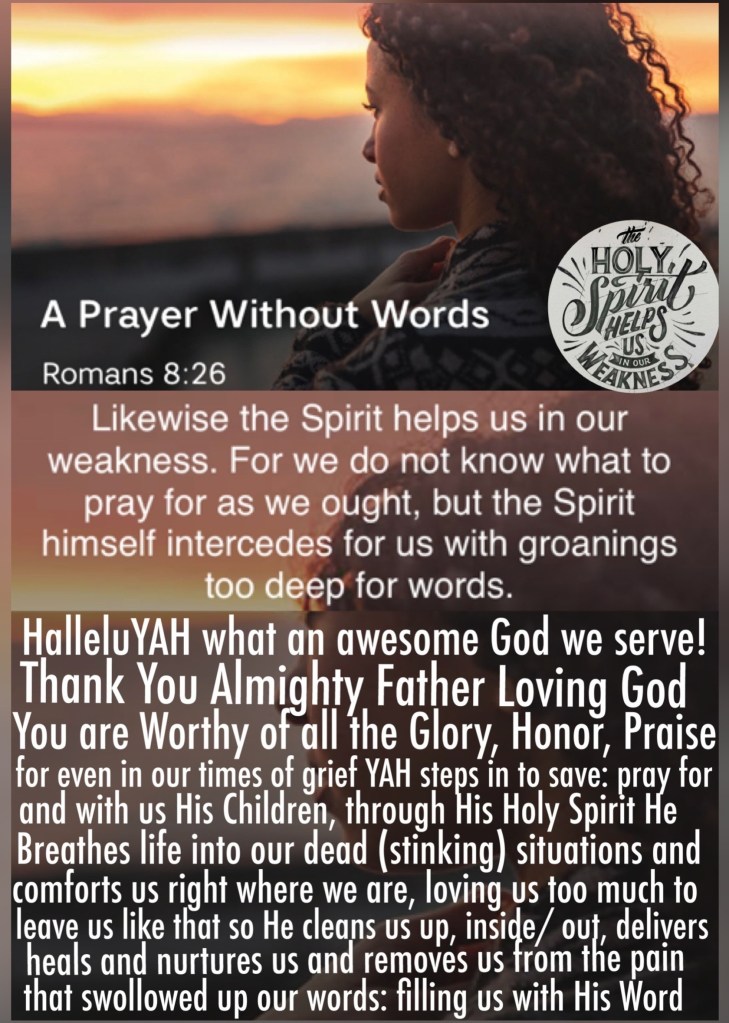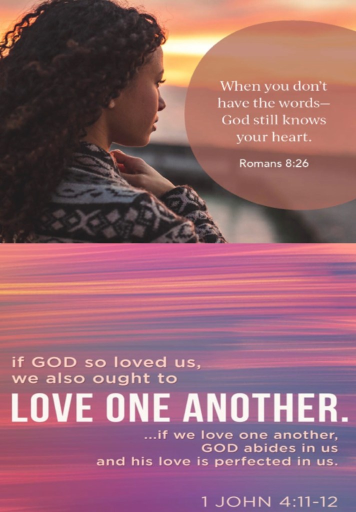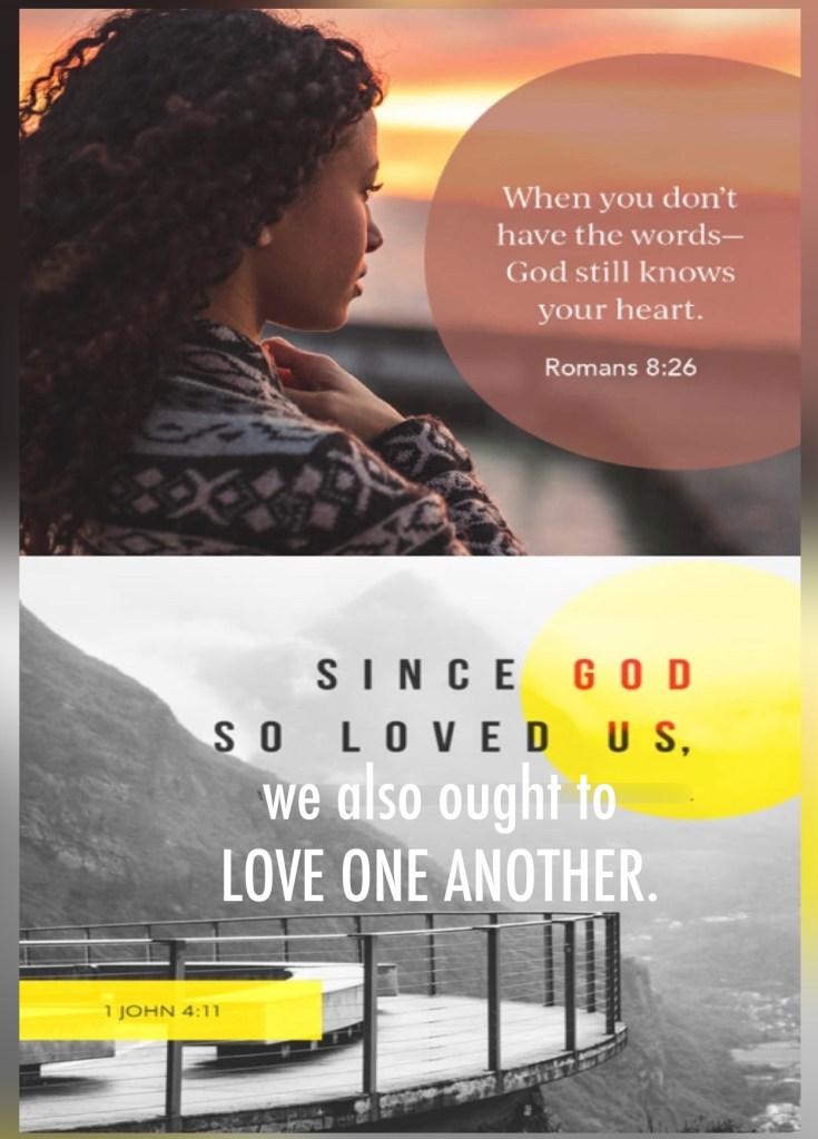 “In the same way The Spirit [comes to us and] helps us in our weakness. We do not know what prayer to offer or how to offer it as we should, but The Spirit Himself [knows our need and at the right time] intercedes on our behalf with sighs and groanings too deep for words.” Romans 8:26 AMP “Beloved, if God so loved us [in this incredible way], we also ought to love one another.” 1 John 4:11 AMP