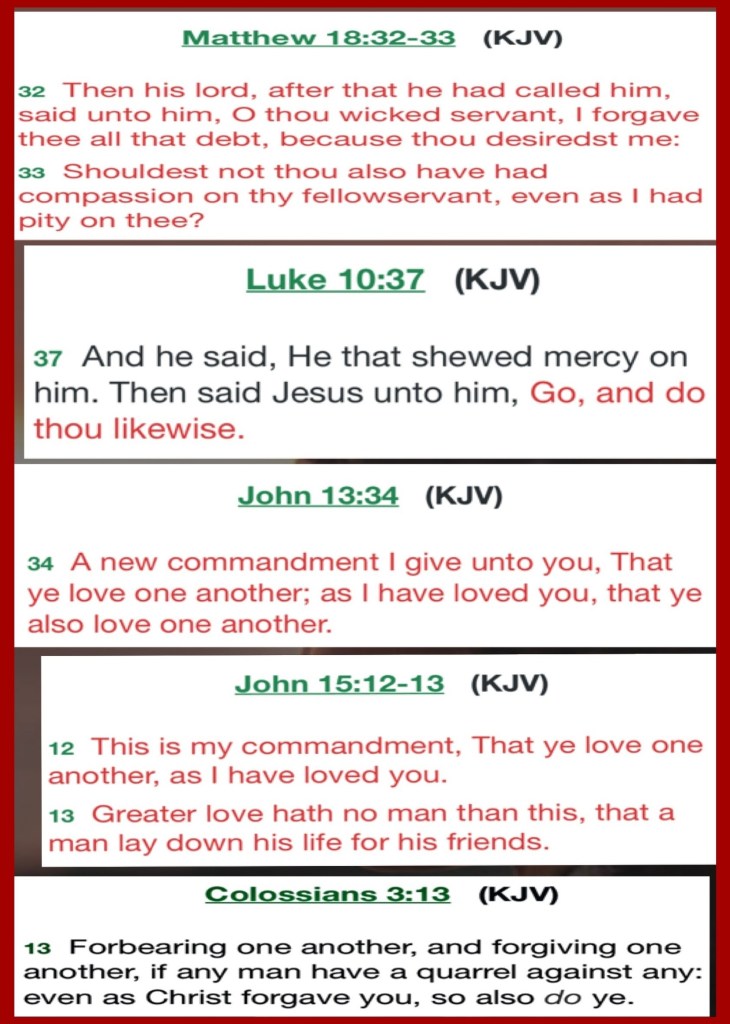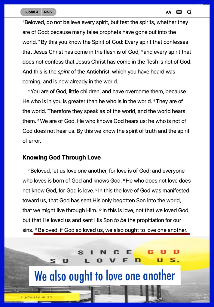1Jn 4:11 Beloved, if God so loved us, we ought also to love one another. 1Jn 3:16-17, 1Jn 3:23; Mat 18:32-33; Luk 10:37; Joh 13:34, Joh 15:12-13; 2Co 8:8-9; Eph 4:31-32, Eph 5:1-2; Col 3:13