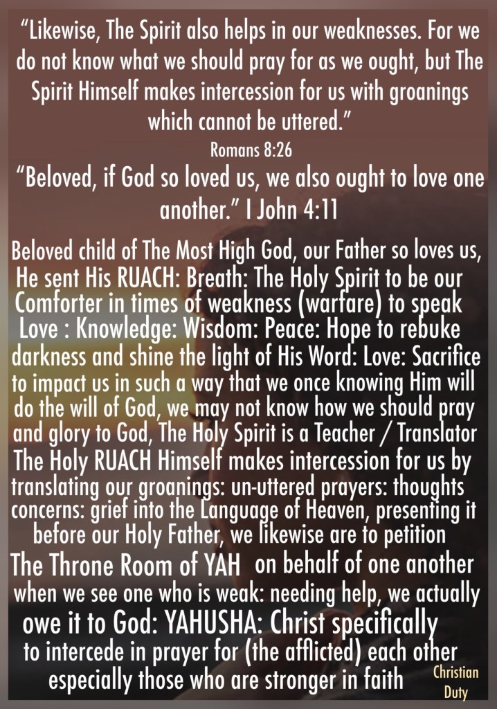 “Likewise The Spirit also helps in our weaknesses. For we do not know what we should pray for as we ought, but The Spirit Himself makes intercession for us with groanings which cannot be uttered.” Romans 8:26 “Beloved, if God so loved us, we also ought to love one another.” I John 4:11