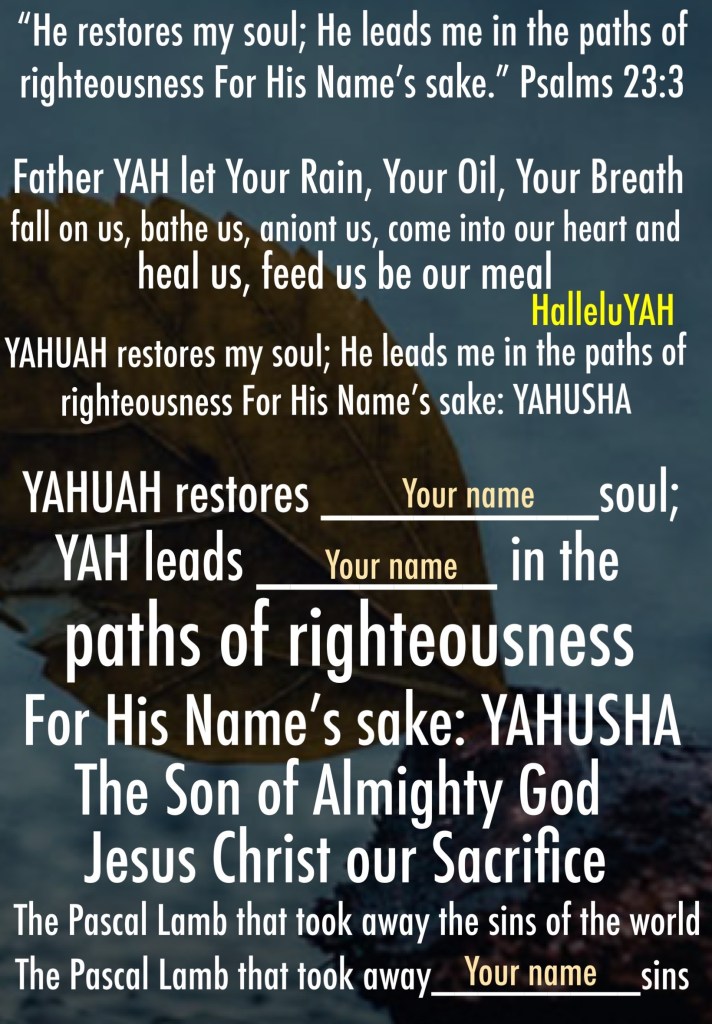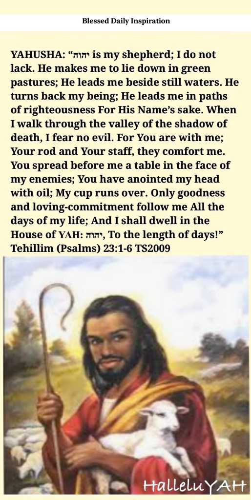 YAHUSHA: βΧΧΧΧ is my shepherd; I do not lack. He makes me to lie down in green pastures; He leads me beside still waters. He turns back my being; He leads me in paths of righteousness For His Nameβs sake. When I walk through the valley of the shadow of death, I fear no evil. For You are with me; Your rod and Your staff, they comfort me. You spread before me a table in the face of my enemies; You have anointed my head with oil; My cup runs over. Only goodness and loving-commitment follow me All the days of my life; And I shall dwell in the House of YAH: ΧΧΧΧ, To the length of days!βββTehillim (Psalms)β¬ β23β¬:β1β¬-β6β¬ βTS2009β¬β¬