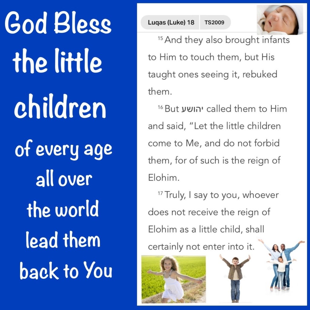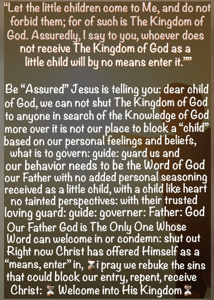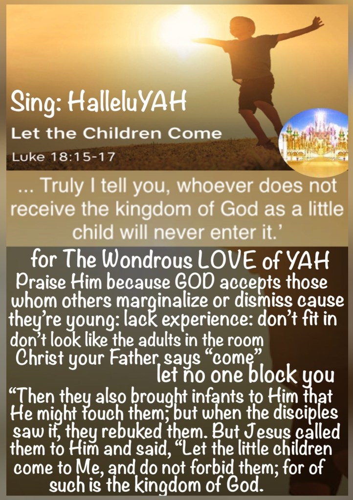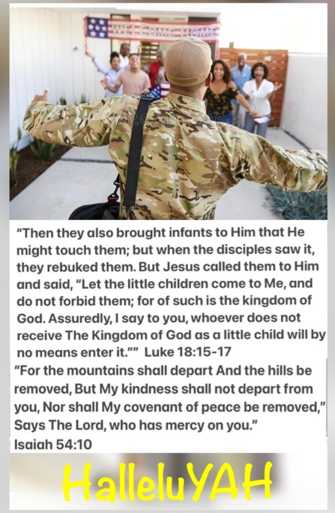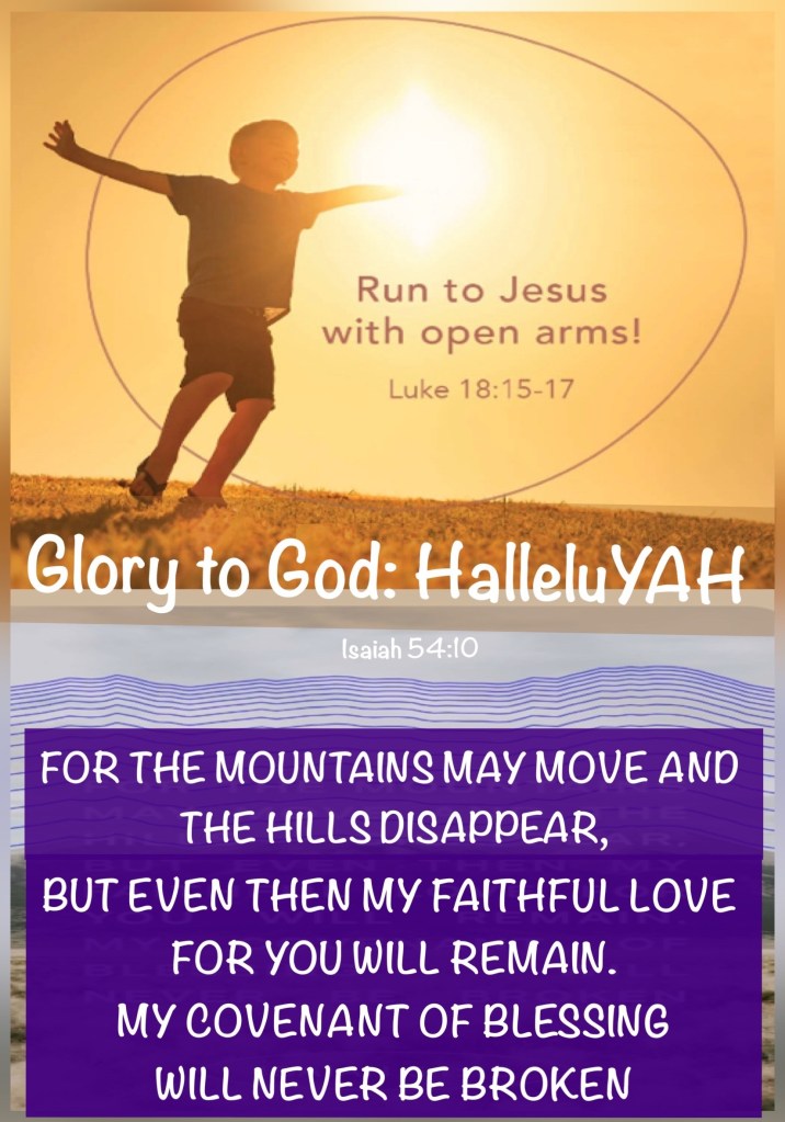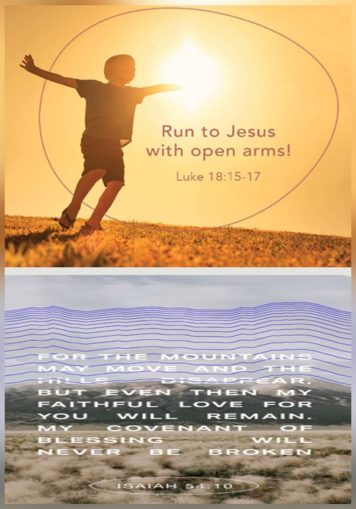 “Now they were also bringing their babies to Him, so that He would touch and bless them, and when the disciples noticed it, they began reprimanding them. But Jesus called them to Himself, saying [to the apostles], “Allow the children to come to Me, and do not forbid them, for The Kingdom of God belongs to such as these. I assure you and most solemnly say to you, whoever does not receive the kingdom of God [with faith and humility] like a child will not enter it at all.”” Luke 18:15-17 AMP “For the mountains may be removed and the hills may shake, But My lovingkindness will not be removed from you, Nor will My covenant of peace be shaken,” Says the Lord who has compassion on you.” Isaiah 54:10 AMP