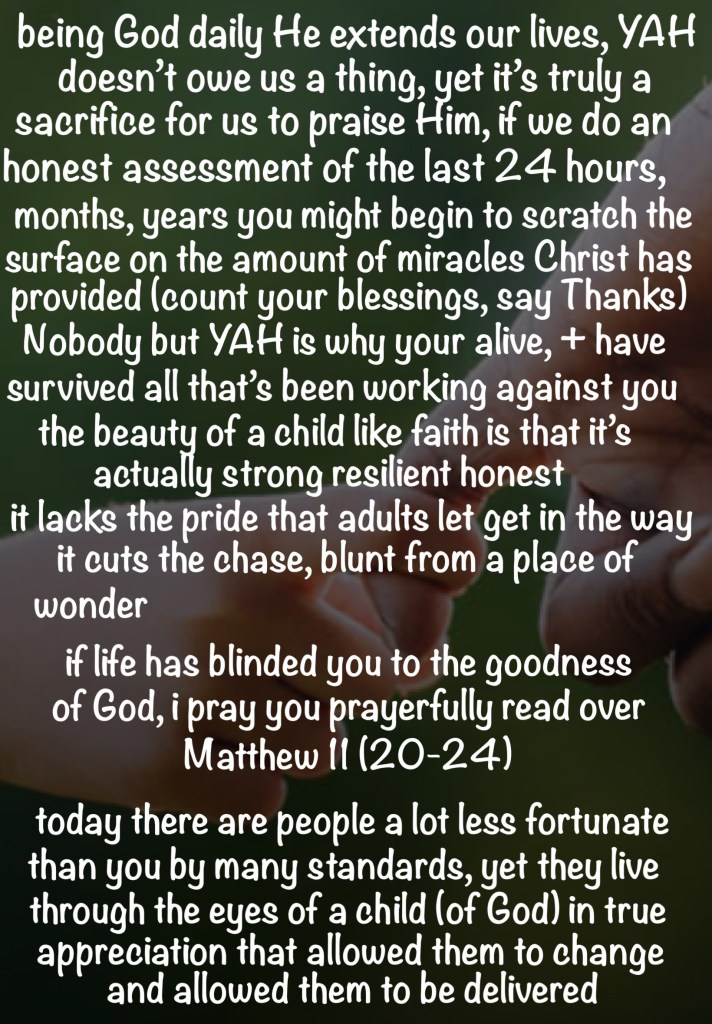 “At that time יהושע responding, said, “I thank You, Father, Master of the heavens and earth, because You have hidden these matters from clever and learned ones and have revealed them to babes.” Mattithyahu (Matthew) 11:25 TS2009 “יהוה is my strength, and my shield; My heart has trusted in Him, and I have been helped; Therefore my heart exults, And with my song I thank Him.” Tehillim (Psalms) 28:7 TS2009 יהושע: YAHUSHA: Jesus, יהוה: YAHUAH