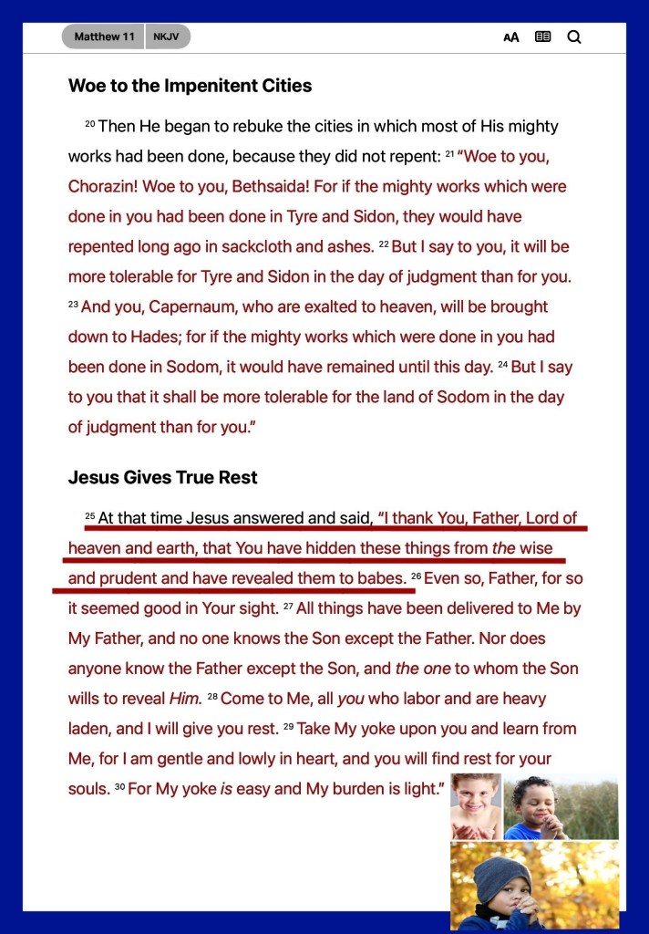 Mat 11:25 At that time Jesus answered and said, I thank thee, O Father, Lord of heaven and earth, because thou hast hid these things from the wise and prudent, and hast revealed them unto babes.