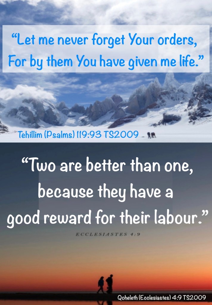 โLet me never forget Your orders, For by them You have given me life.โTehillim (Psalms) 119:93 TS2009 โTwo are better than one, because they have a good reward for their labour.โ Qoheleth (Ecclesiastes) 4:9 TS2009