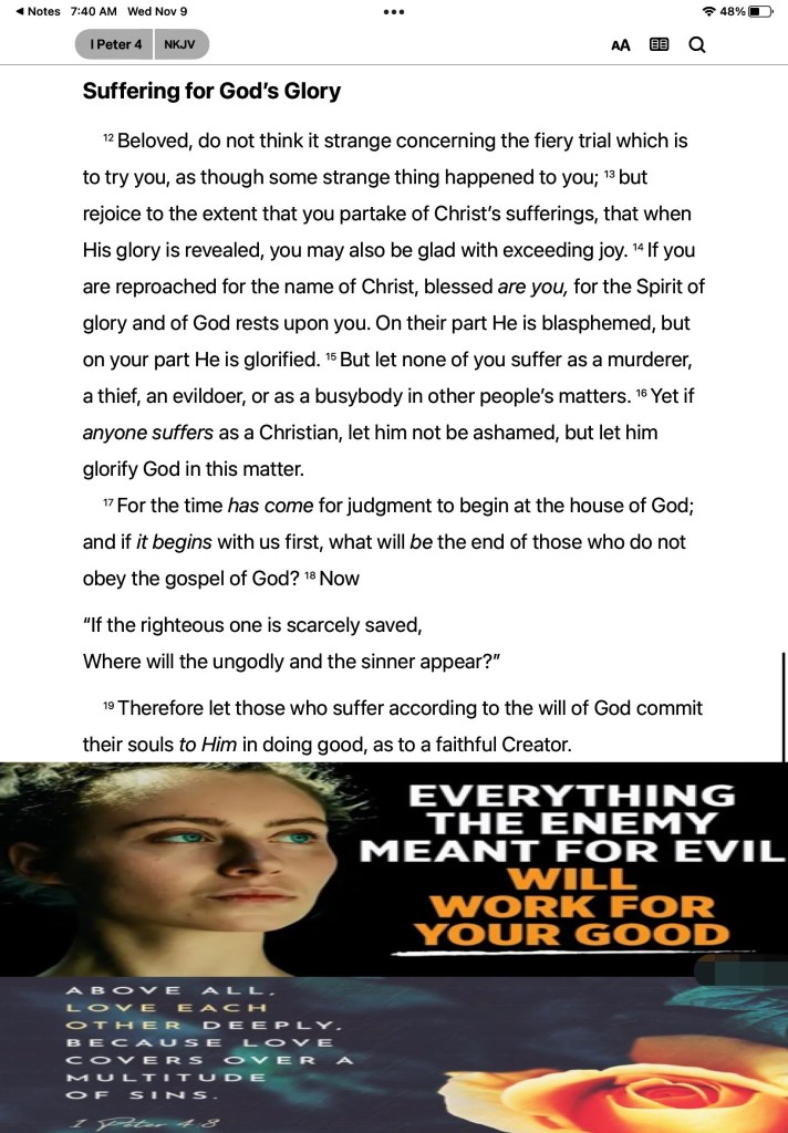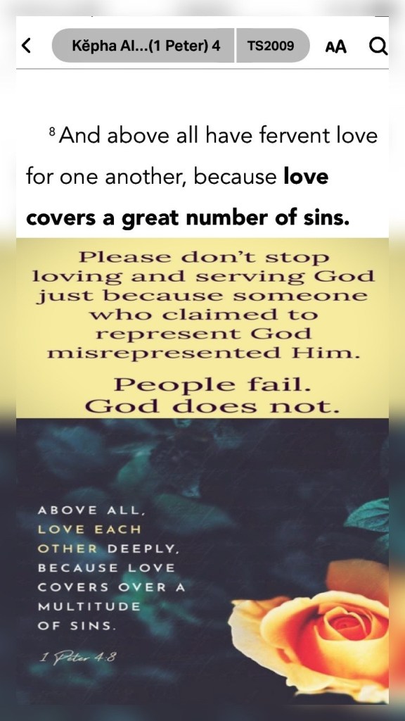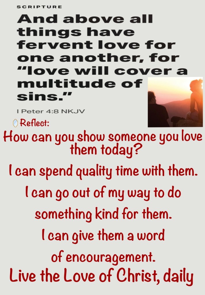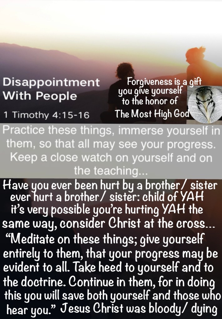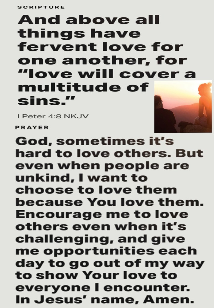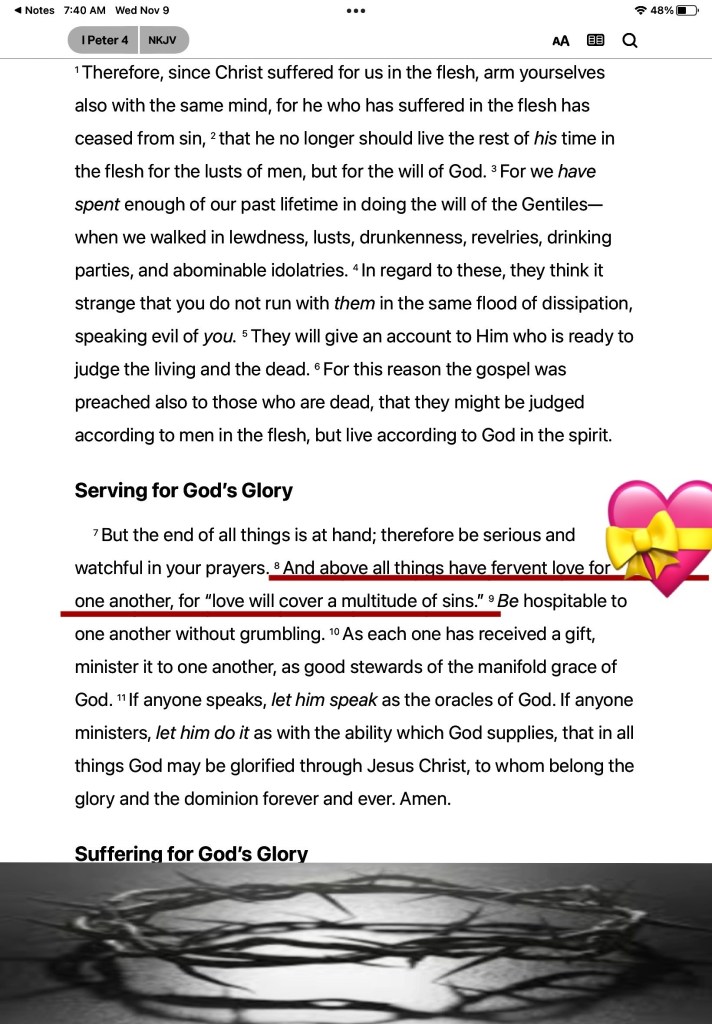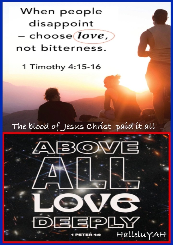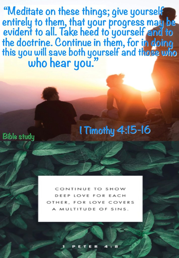 “Meditate on these things; give yourself entirely to them, that your progress may be evident to all. Take heed to yourself and to the doctrine. Continue in them, for in doing this you will save both yourself and those who hear you.” I Timothy 4:15-16 “And above all things have fervent love for one another, for “love will cover a multitude of sins.” I Peter 4:8