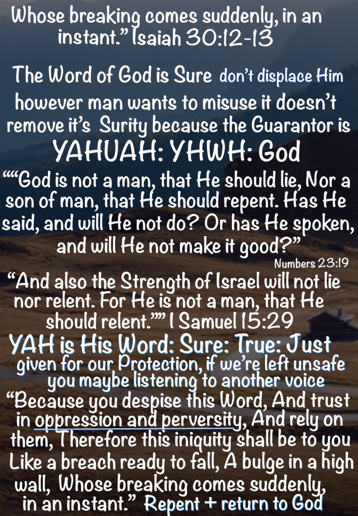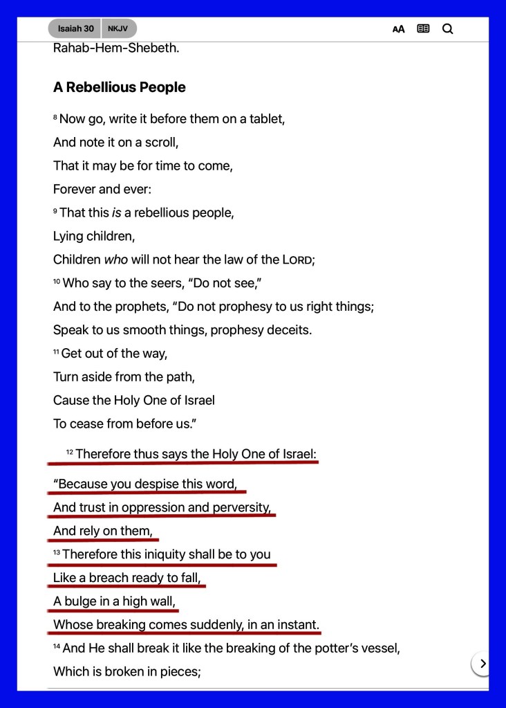 Isa 30:13 Therefore this iniquity shall be to you as a breach ready to fall, swelling out in a high wall, whose breaking cometh suddenly at an instant.