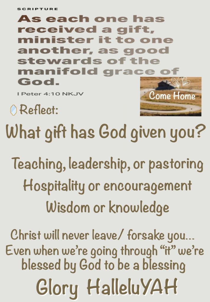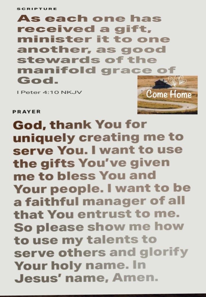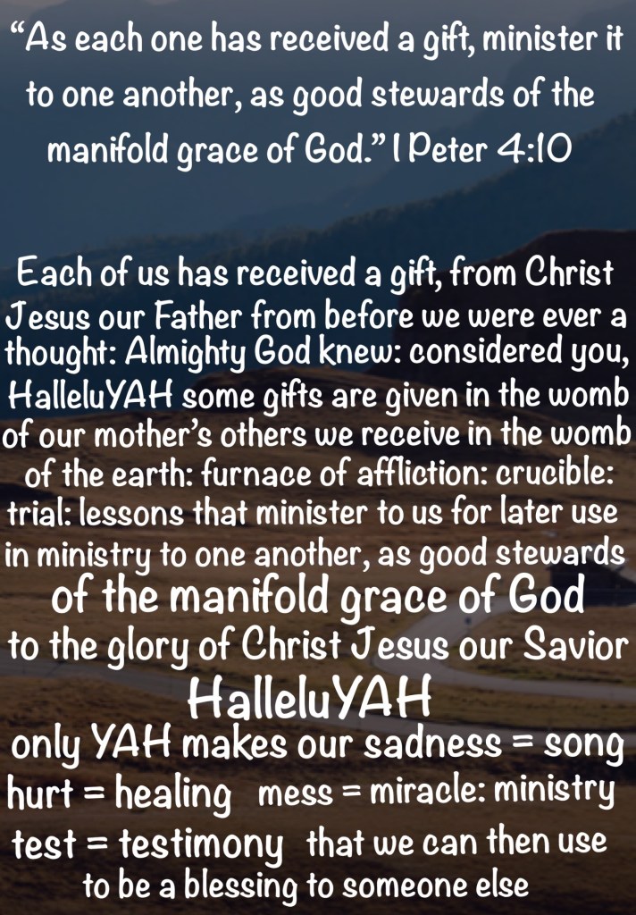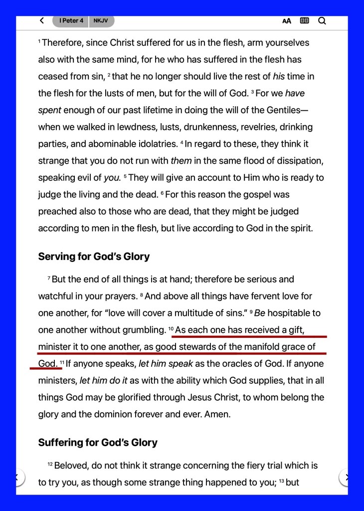 1Pe 4:10 As every man hath received the gift, even so minister the same one to another, as good stewards of the manifold grace of God.
