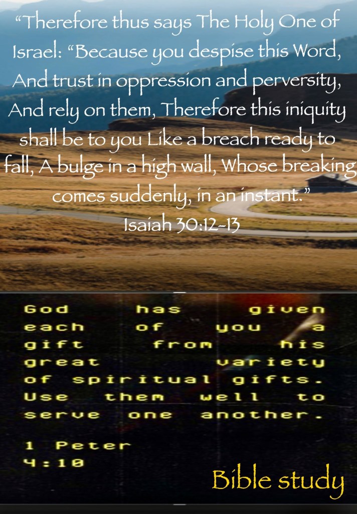 “Therefore thus says The Holy One of Israel: “Because you despise this Word, And trust in oppression and perversity, And rely on them, Therefore this iniquity shall be to you Like a breach ready to fall, A bulge in a high wall, Whose breaking comes suddenly, in an instant.” Isaiah 30:12-13 “As each one has received a gift, minister it to one another, as good stewards of the manifold grace of God.” I Peter 4:10