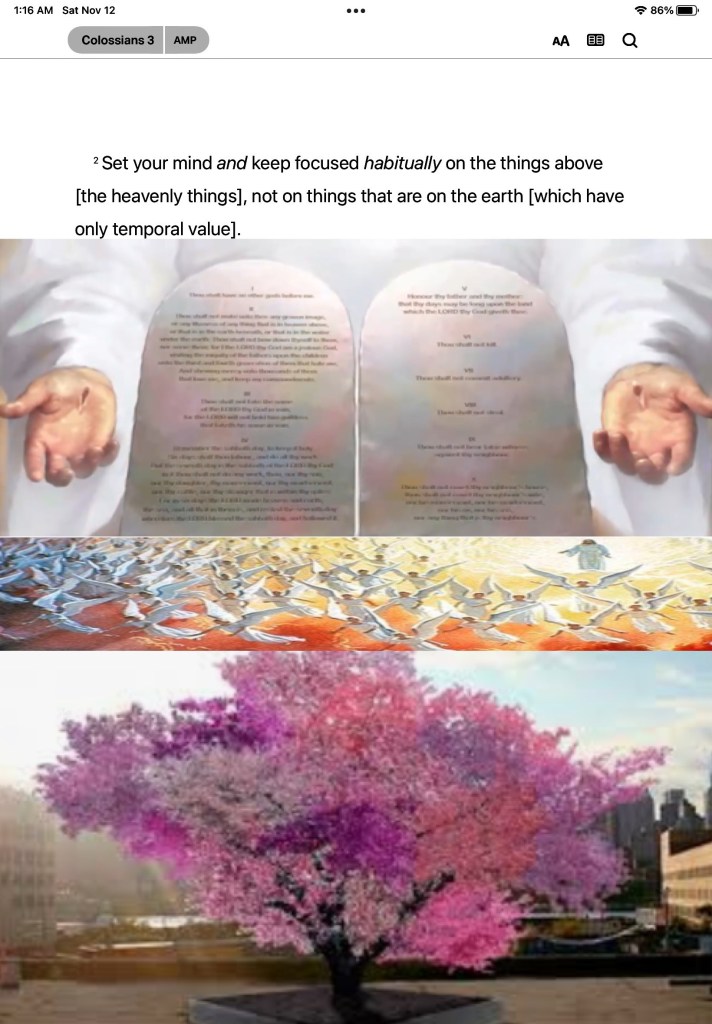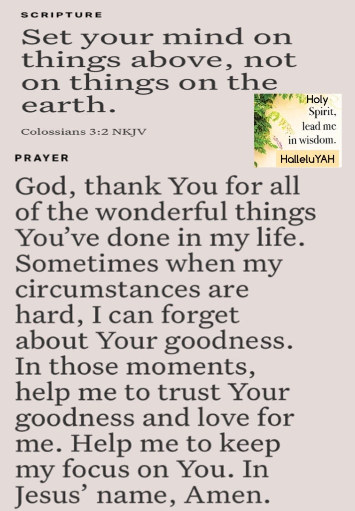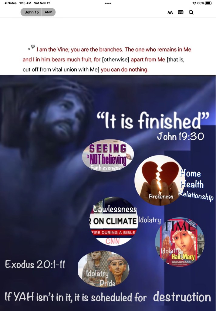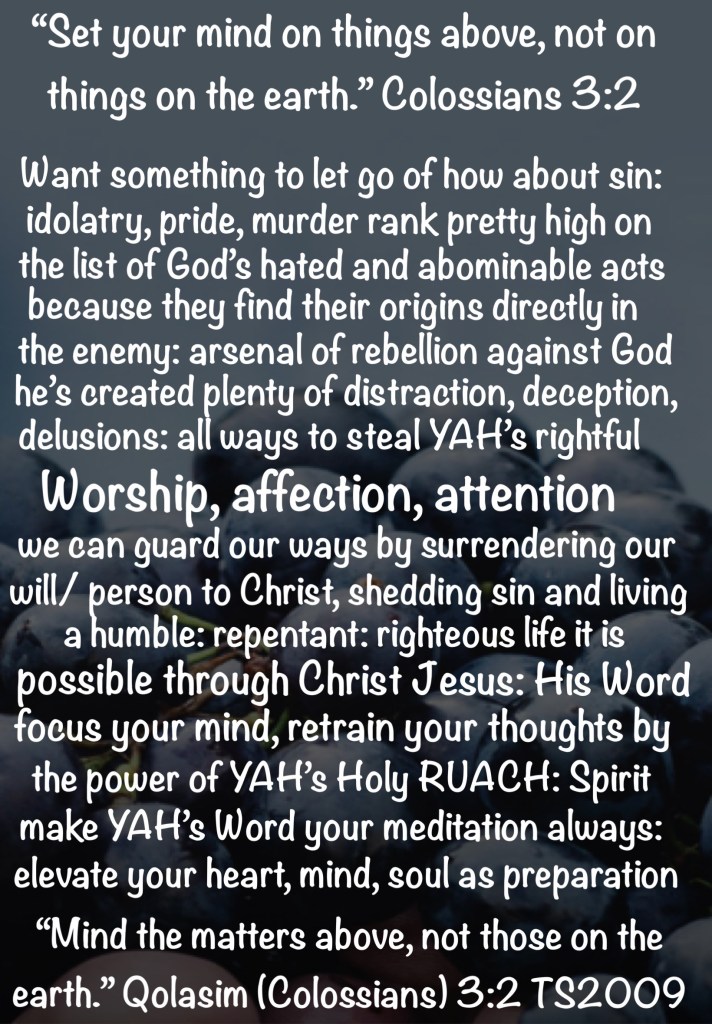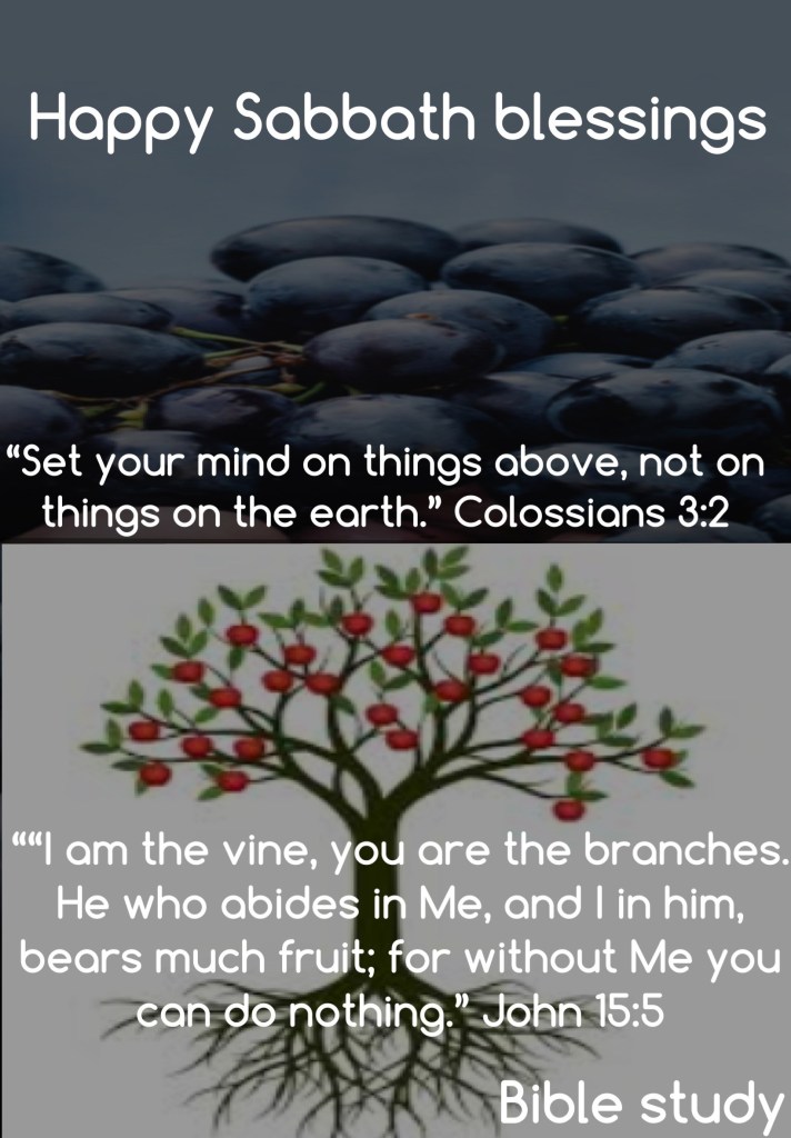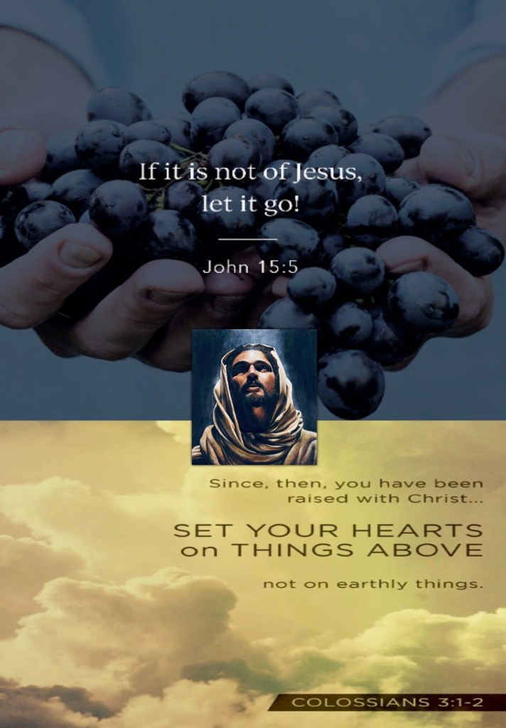 ““I am the vine, you are the branches. He who abides in Me, and I in him, bears much fruit; for without Me you can do nothing.” John 15:5 “Set your mind on things above, not on things on the earth.” Colossians 3:2 meditate on Exodus 20:1-*8-17