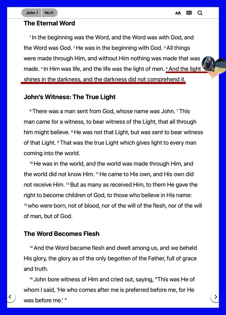Joh 1:5 And the light shineth in darkness; and the darkness comprehended it not.