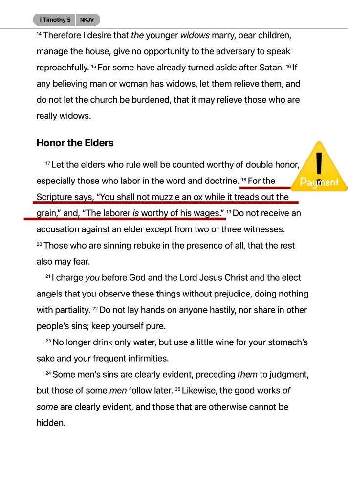 1Ti 5:18 For the scripture saith, Thou shalt not muzzle the ox that treadeth out the corn. And, The labourer is worthy of his reward.
