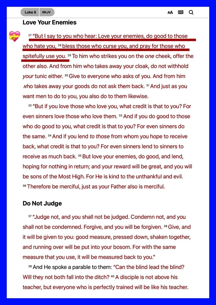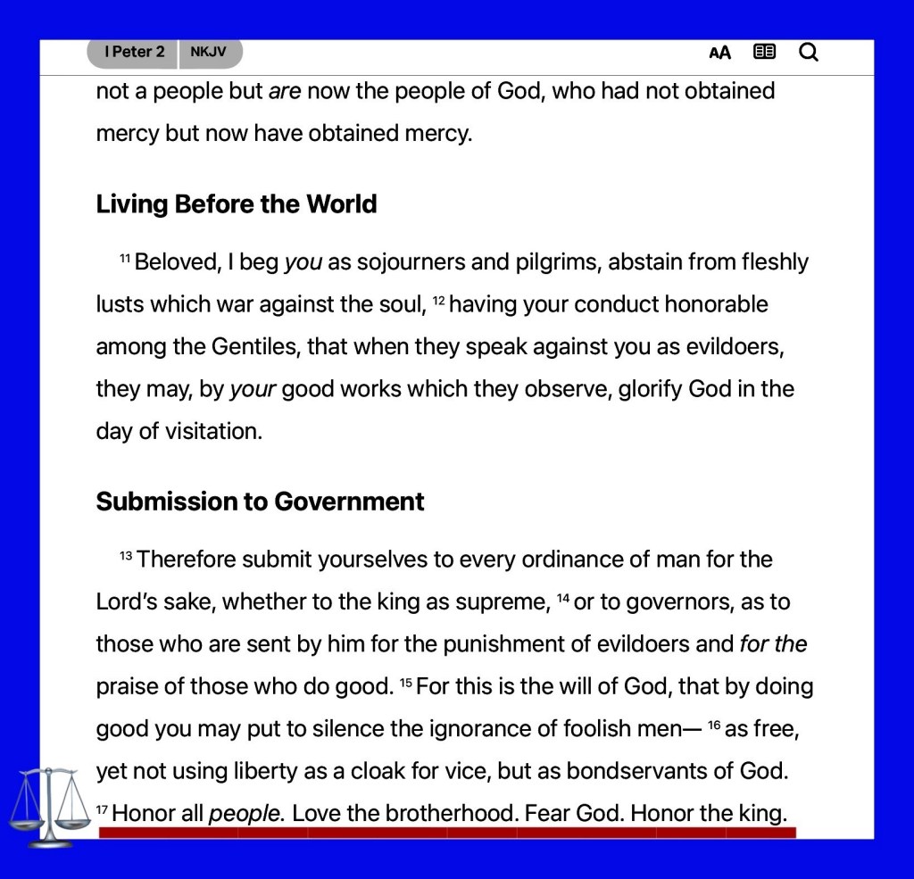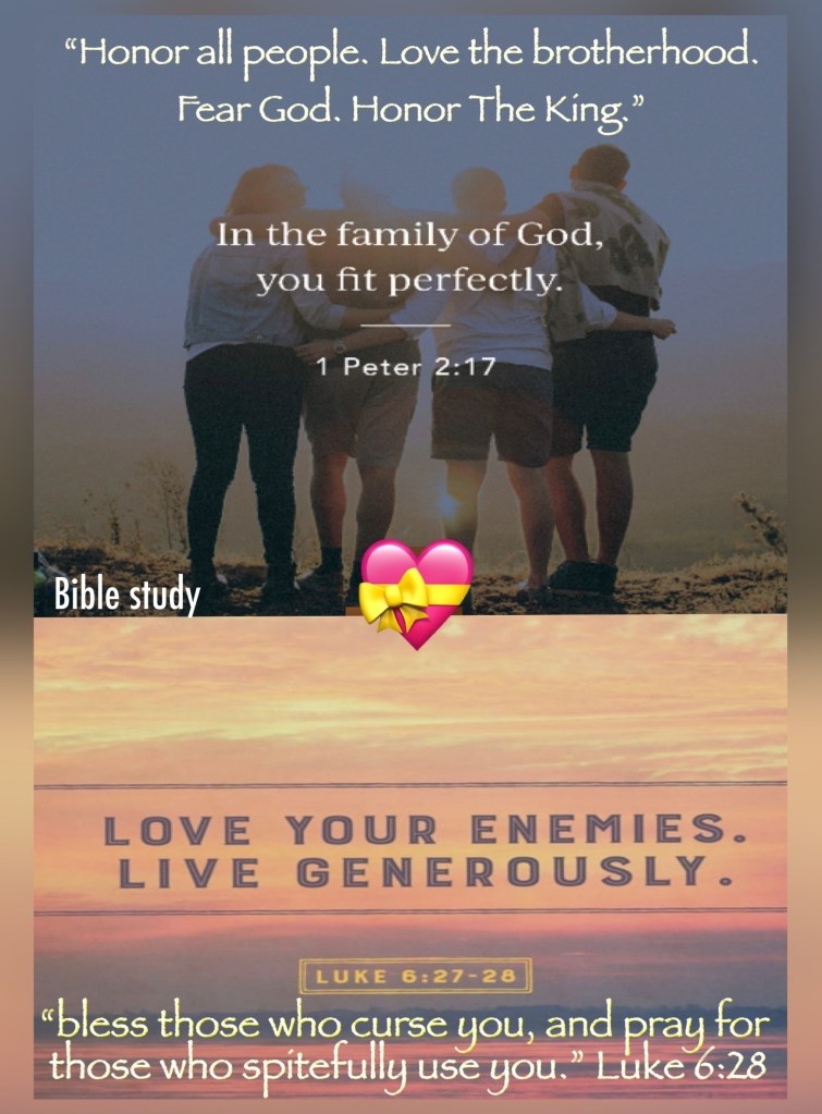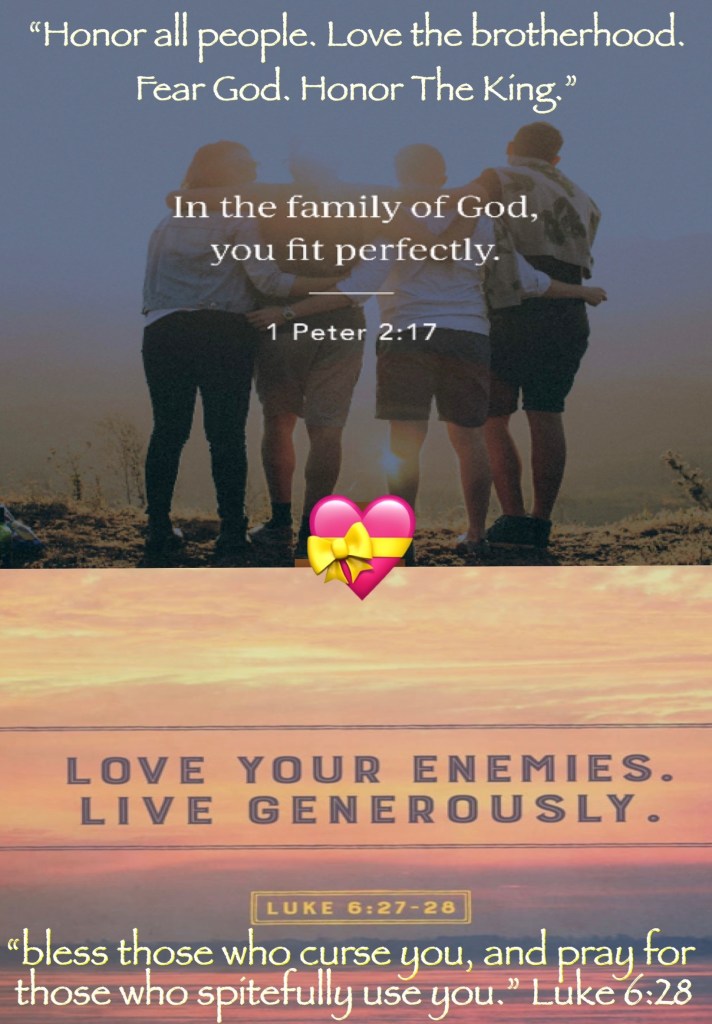 “Honor all people. Love the brotherhood. Fear God. Honor the king.” I Peter 2:17 “bless those who curse you, and pray for those who spitefully use you.” Luke 6:28