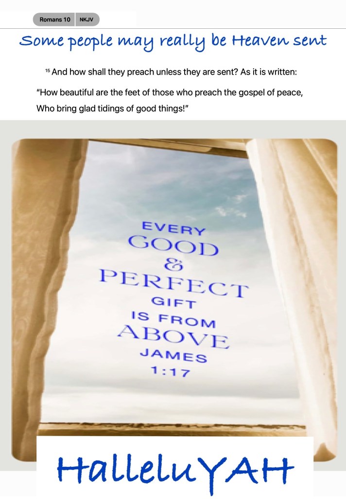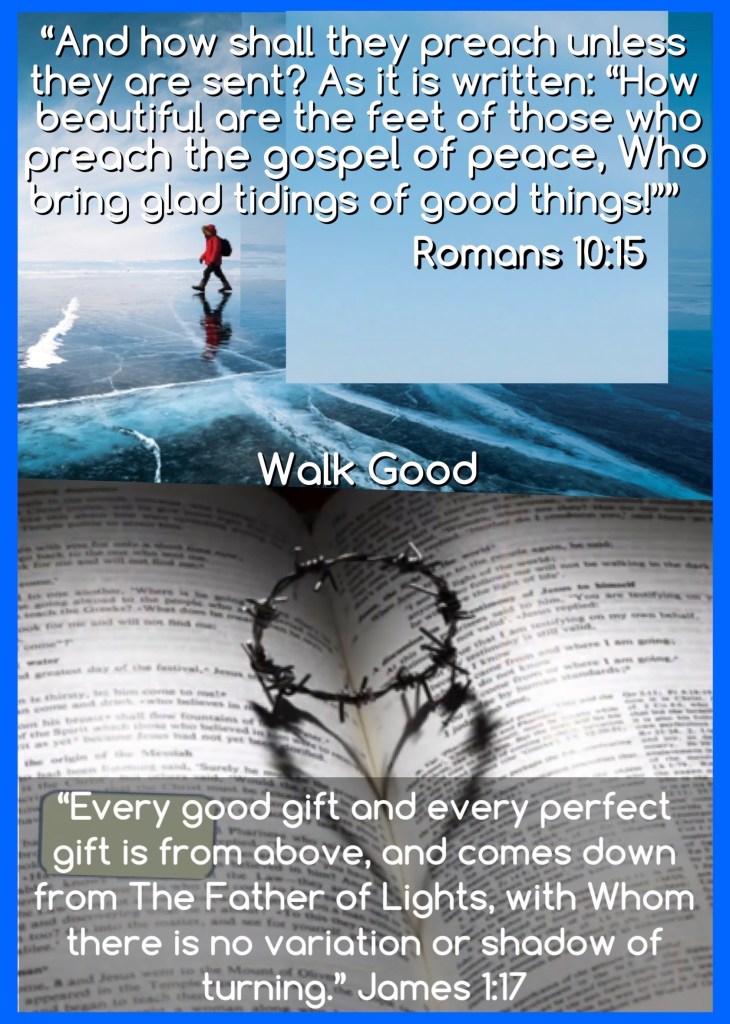 “And how shall they preach unless they are sent? As it is written: “How beautiful are the feet of those who preach the gospel of peace, Who bring glad tidings of good things!”” Romans 10:15 “Every good gift and every perfect gift is from above, and comes down from the Father of lights, with whom there is no variation or shadow of turning.” James 1:17